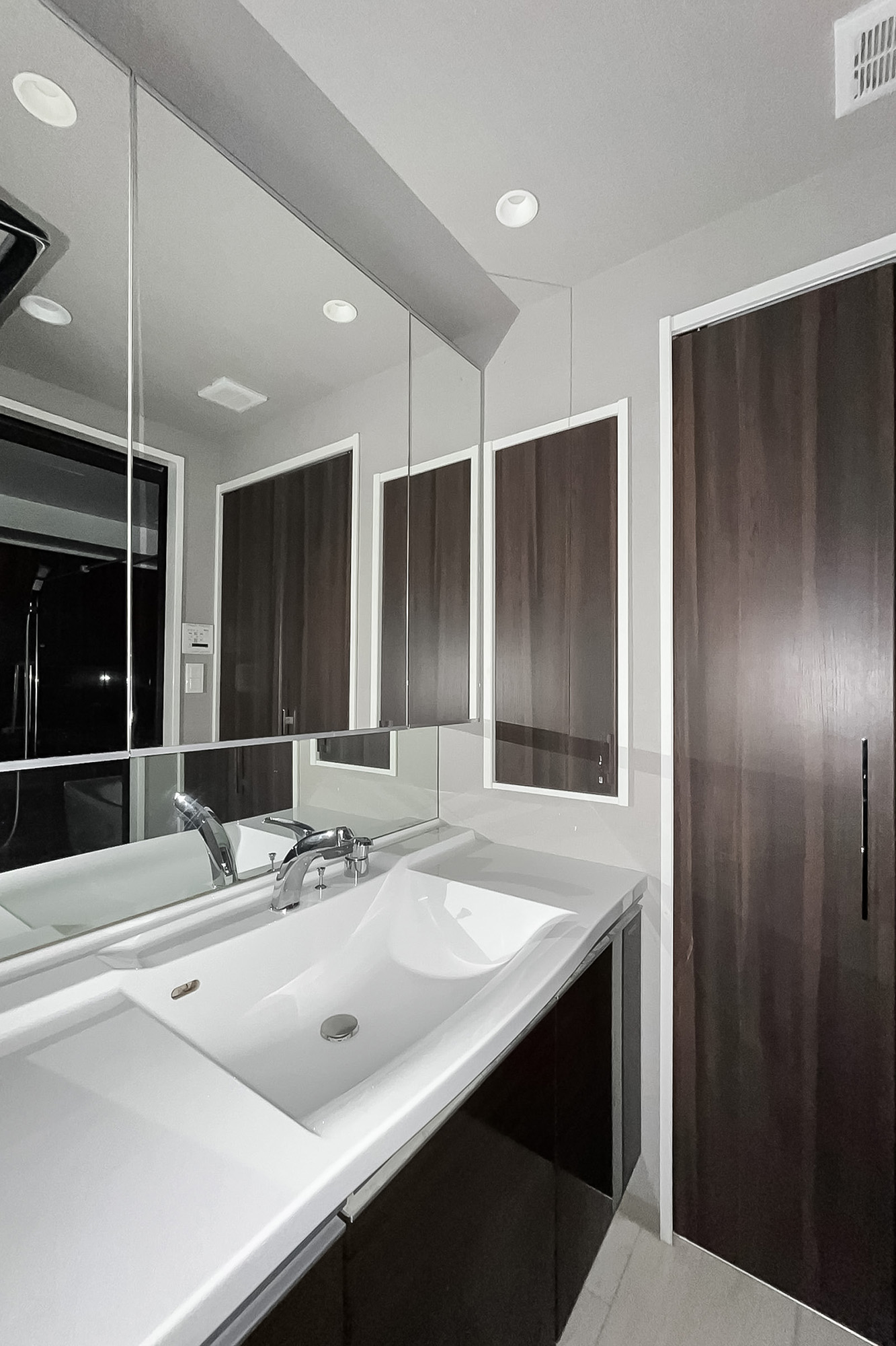 洗面まわりの小物がすっきり整頓できるミラーボックス付きで、いつでも整った状態をキープできそうです。洗濯機置き場は扉付きで生活感が目隠しできます。