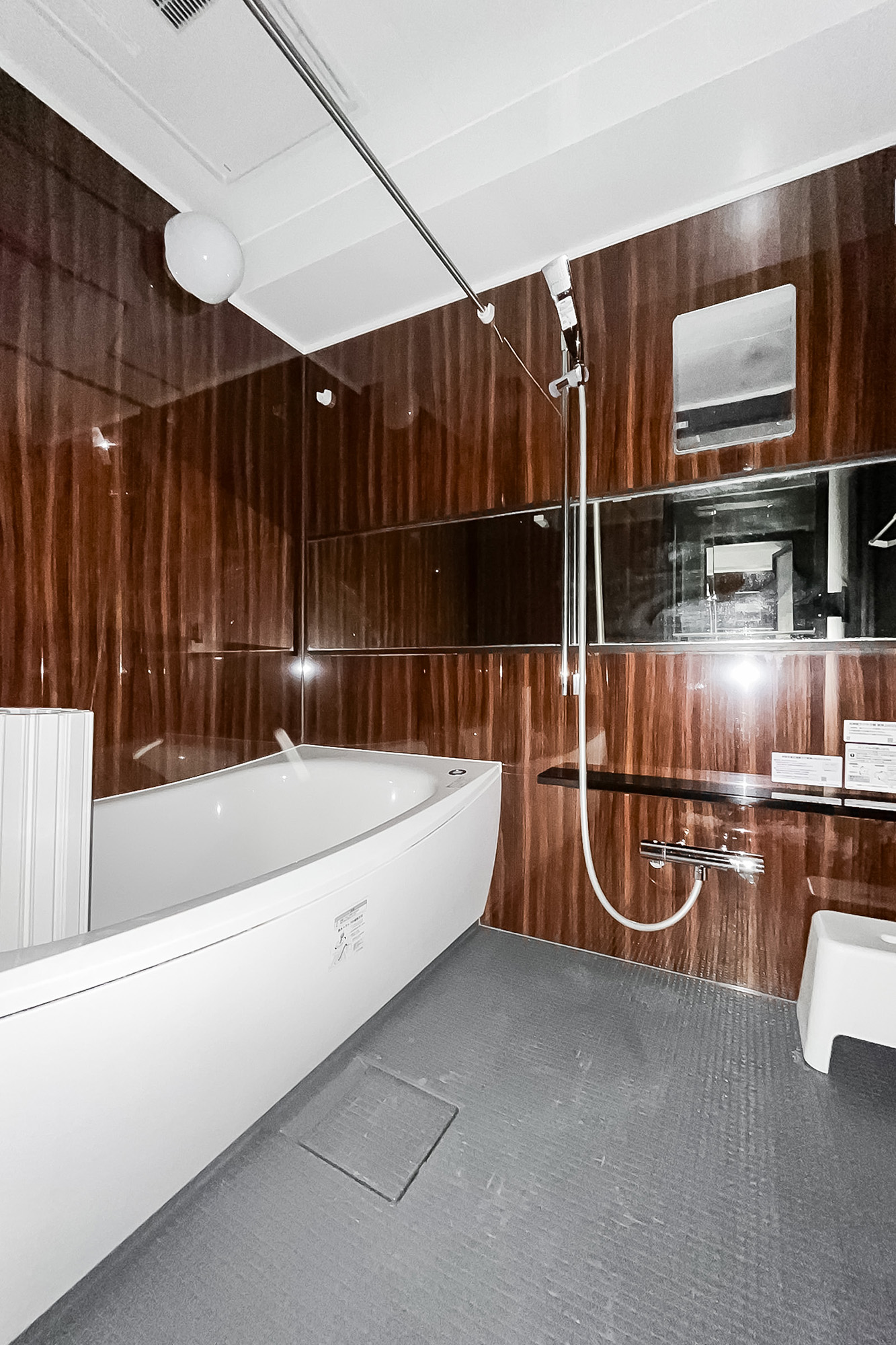 高級感のある雰囲気のバスルーム。追い炊き機能の他、浴室換気乾燥機とランドリーパイプ付きで雨の日や冬場の洗濯にも困りません。