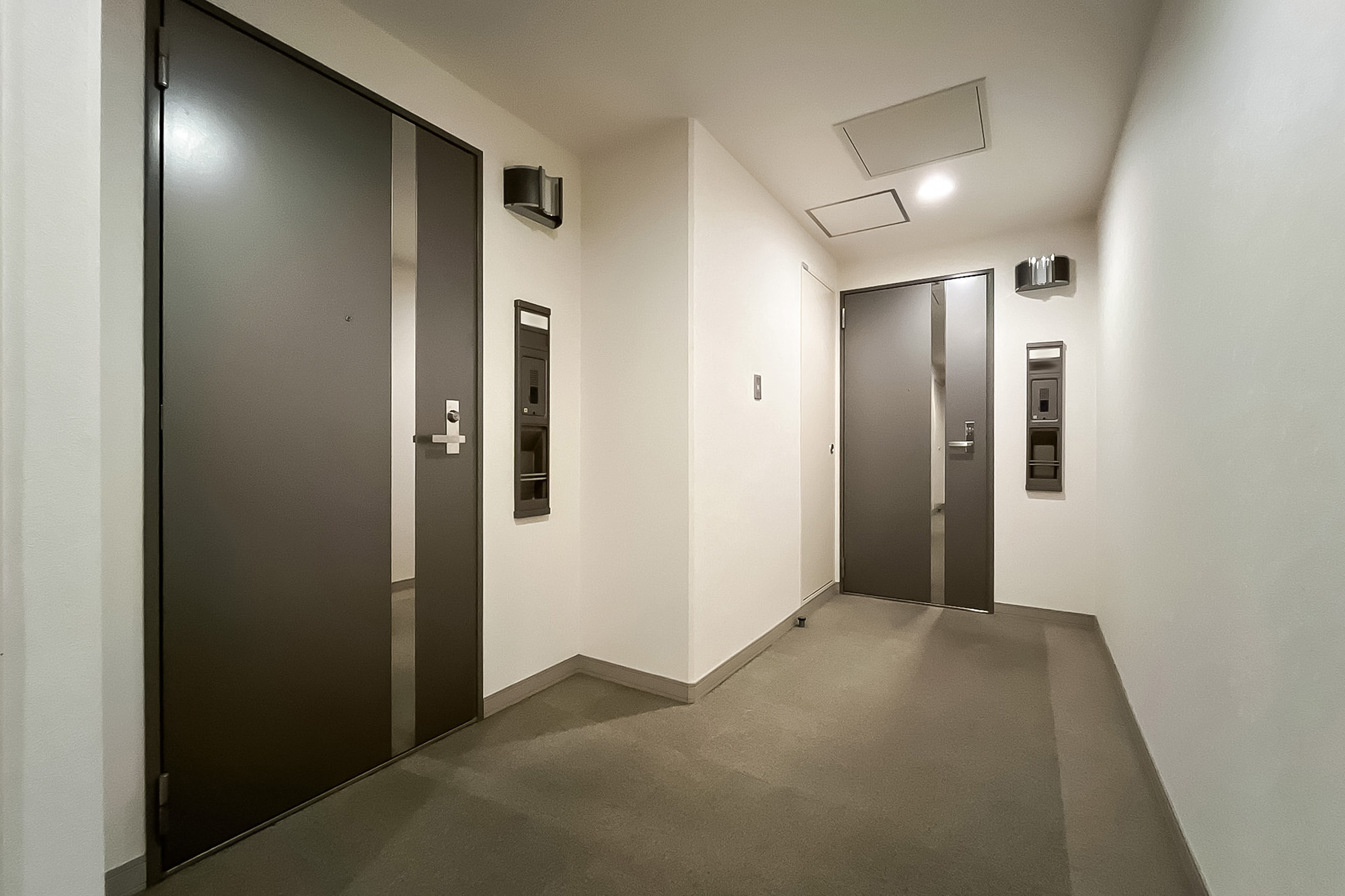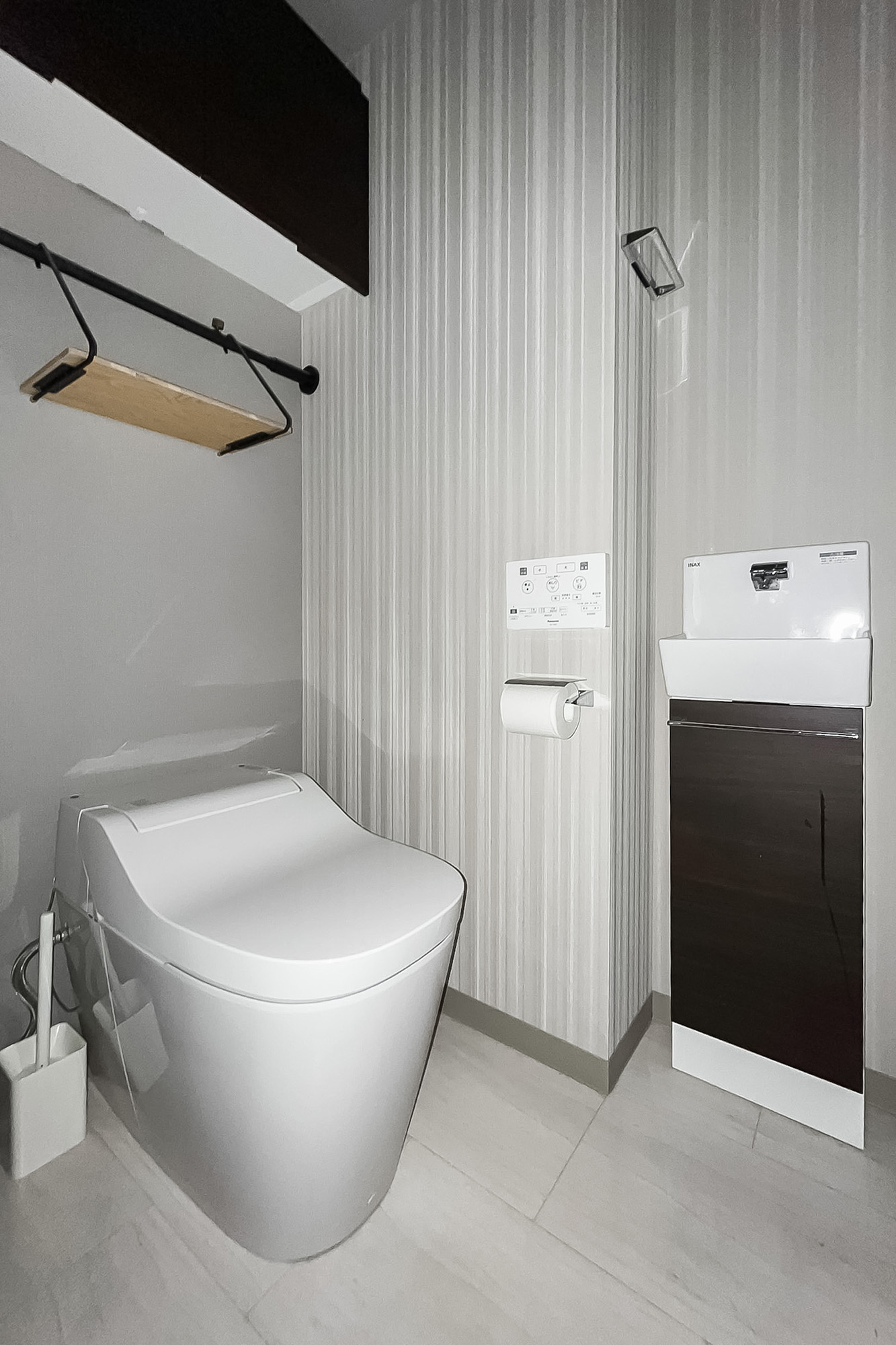 廊下に面したレストルーム。空間がすっきり見えるタンクレストイレです。独立型の手洗い器、収納スペース、ウォシュレットも備わっています。