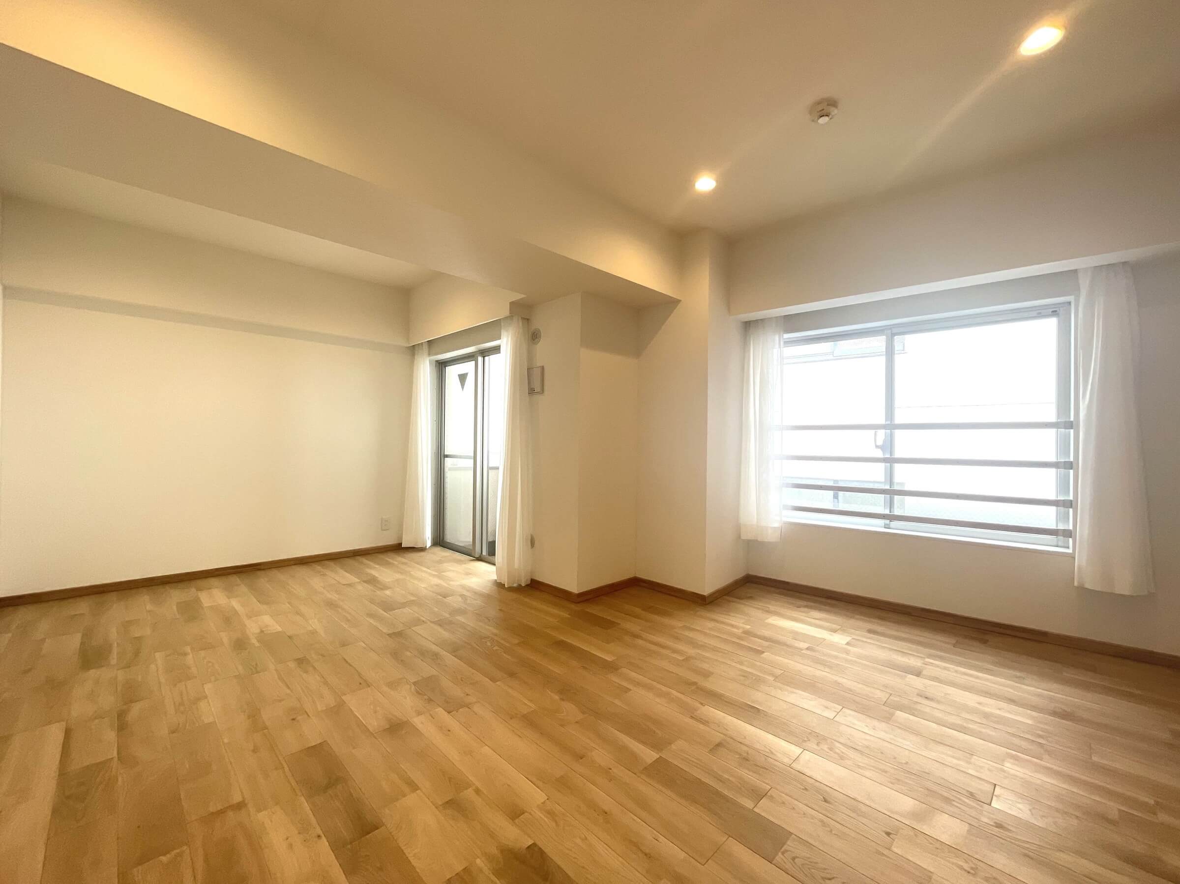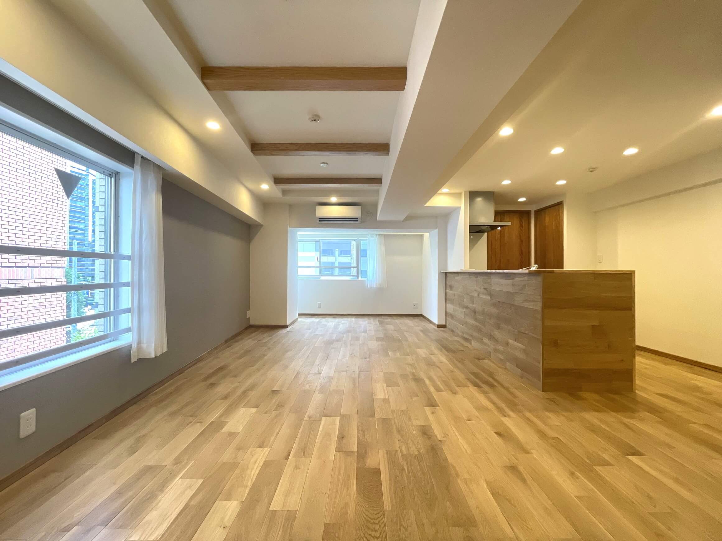 約22.5帖の広々としたリビングダイニングキッチンです。二面採光のため日当たりが良好で、風通しの良い空間となっています。天井にはダウンライトや木材を設置、グレーの壁面もアクセントで上質な雰囲気を漂わせています。