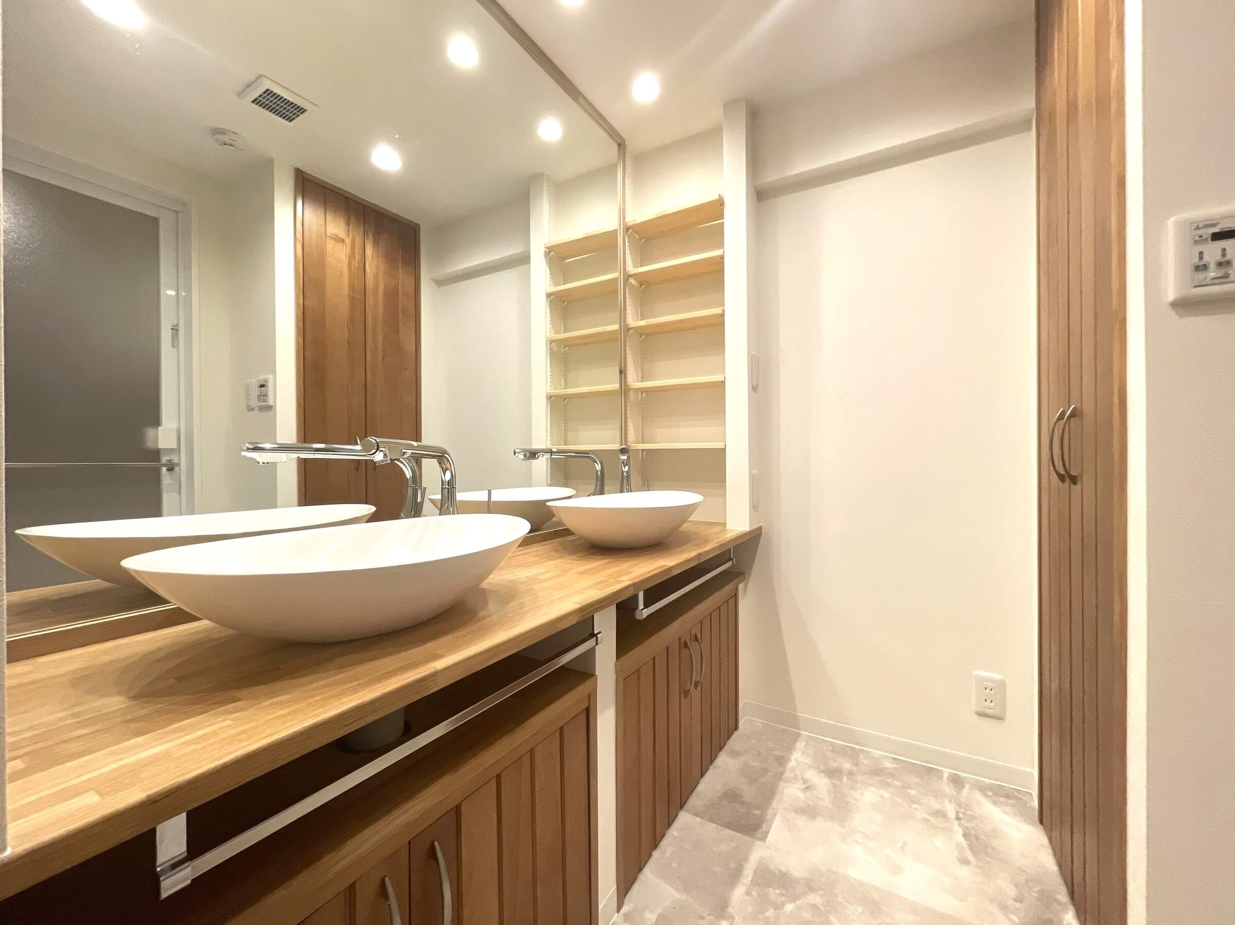 ウッドデザインの洗面台は、置き型式の洗面ボウルが2つも設置されています。忙しい朝でも並んで支度ができるので嬉しいですね。下部収納や壁面収納など、ごちゃごちゃしがちな洗面まわりをきちんと整頓できるように収納スペースが確保されています。