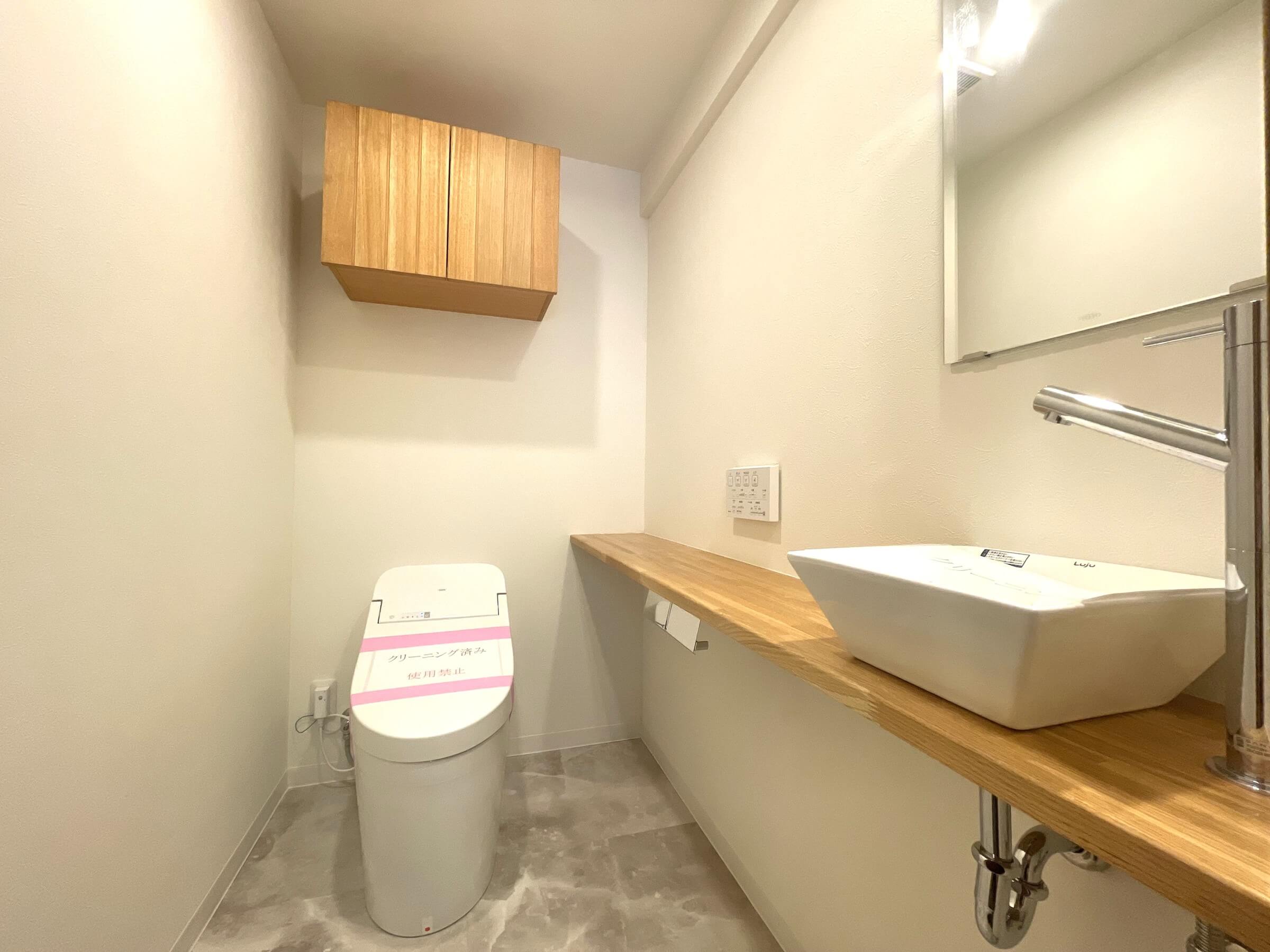 ウォシュレット一体型のトイレです。タンクレスタイプなのですっきりとした印象に。また、別途で手洗い器と鏡が造られているので、その場でサッと身だしなみを整えることができます。上部には吊戸棚が設置されていて、収納スペースもありますよ。カウンタースペースにはアロマなどを置いても◎。