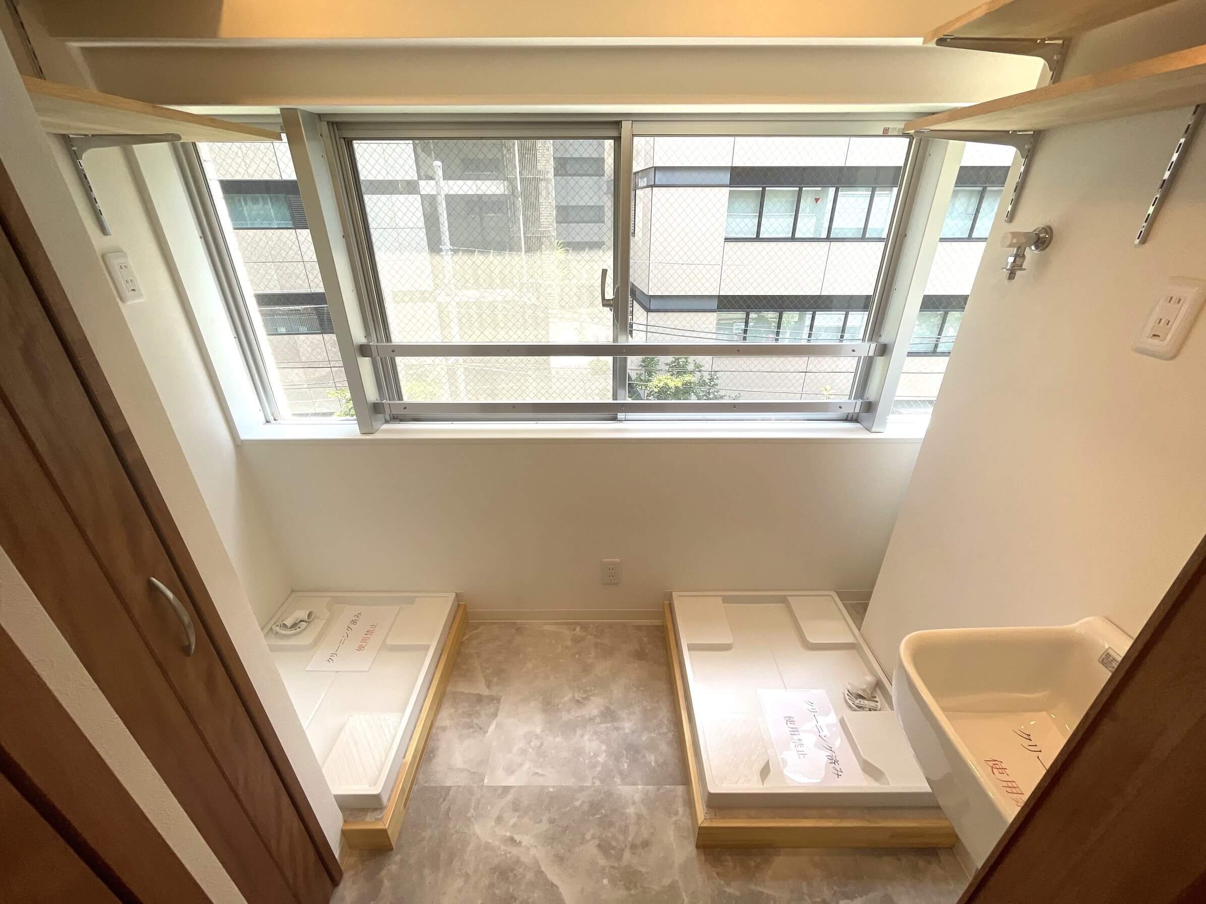キッチン奥には、洗濯機が2台も設置できるユーティリティーが造られています。靴なども洗いやすいスロップシンクも設置されていますよ。