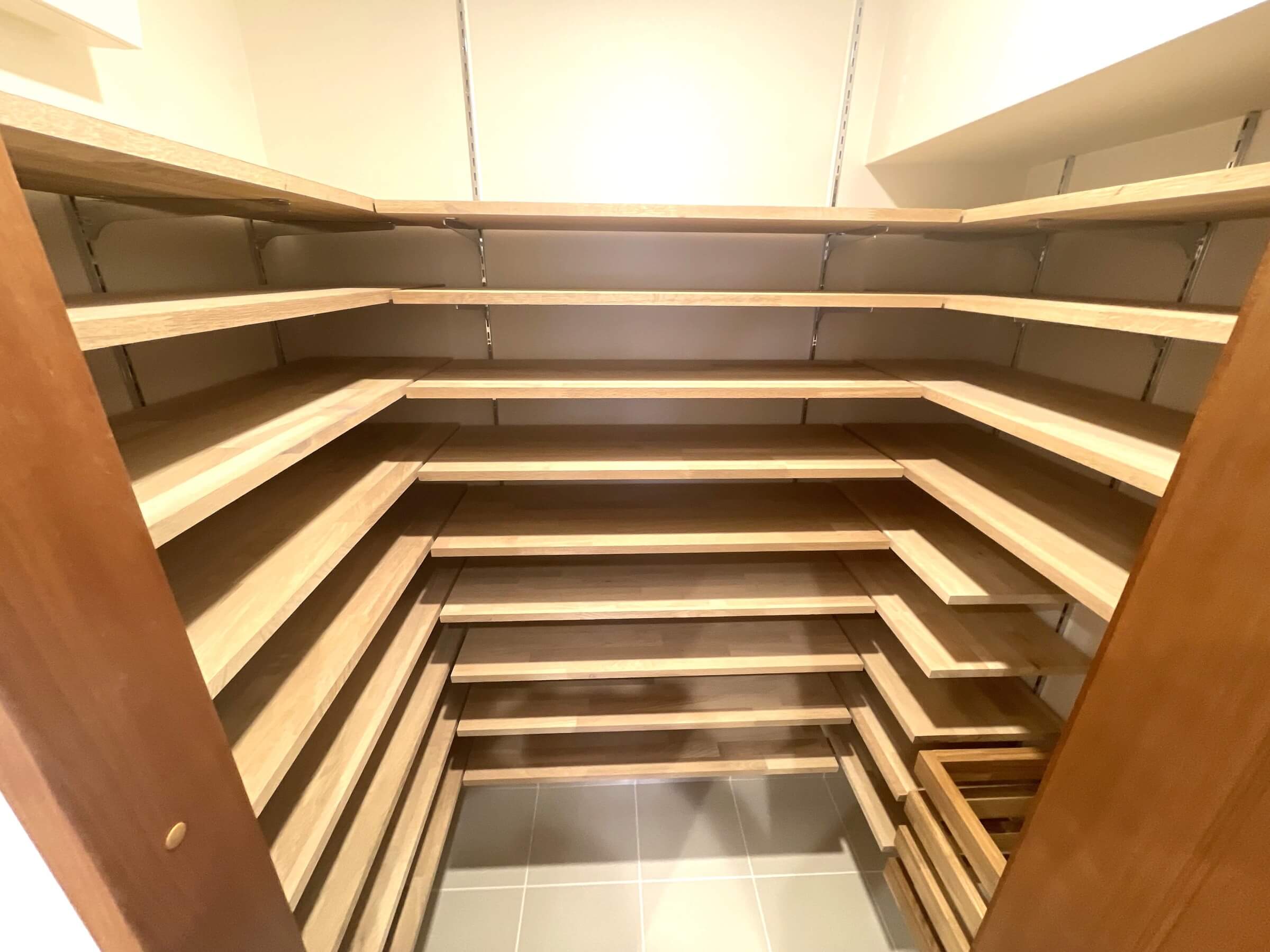 上品な雰囲気の玄関にはシューズインクローゼットが造られています。中には可動棚が設置されているので、たくさんの靴を収納することができますよ。また、照明には人感センサーが付いており、帰宅時に両手が塞がっていても安心です。消し忘れも防止できて節電にもなりますね。