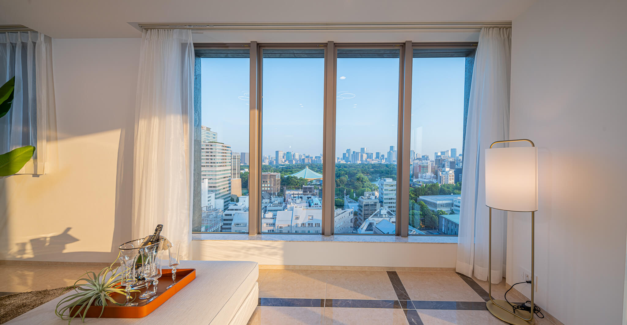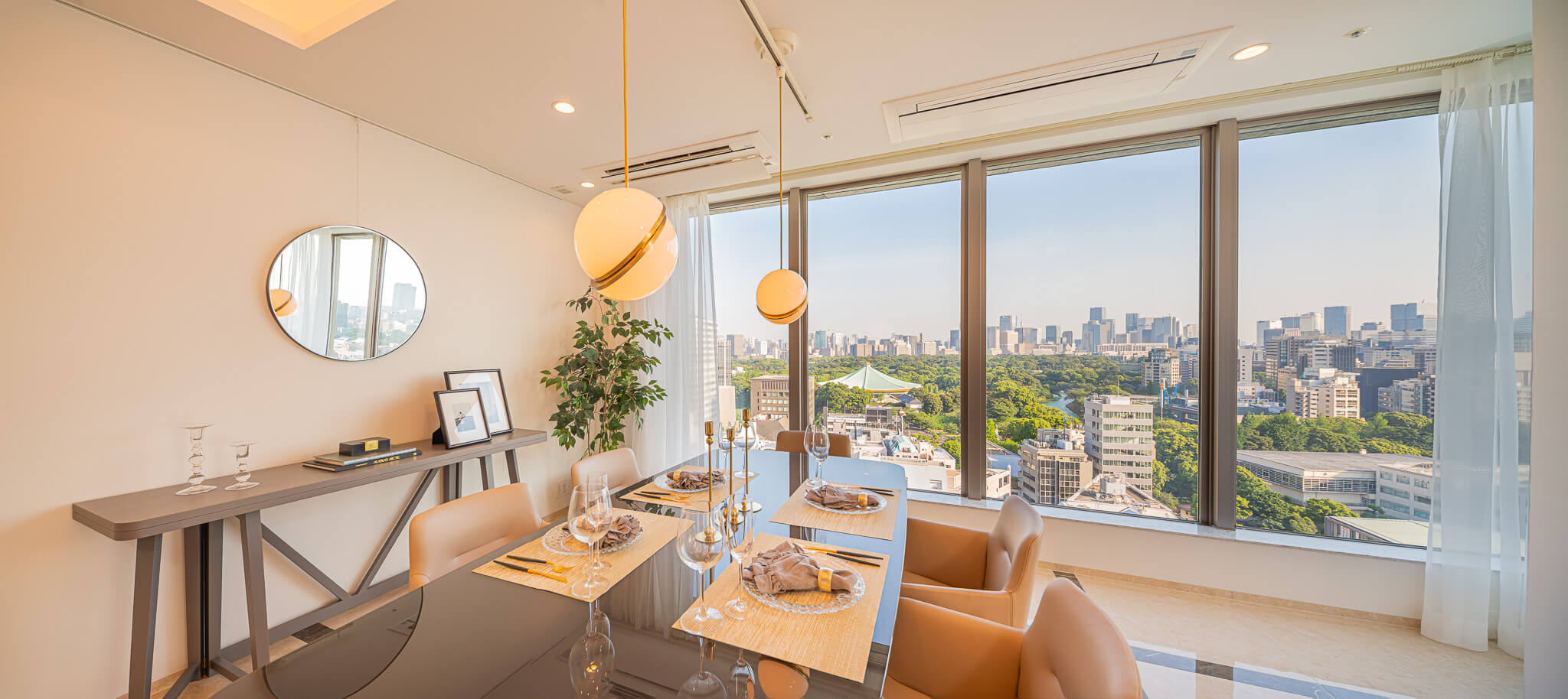 南西向きの二面採光で自然な光が入る明るい空間。ビル群が建ち並ぶ都会的な景色が楽しめます。南の方角には北の丸公園と皇居の緑が望めます。