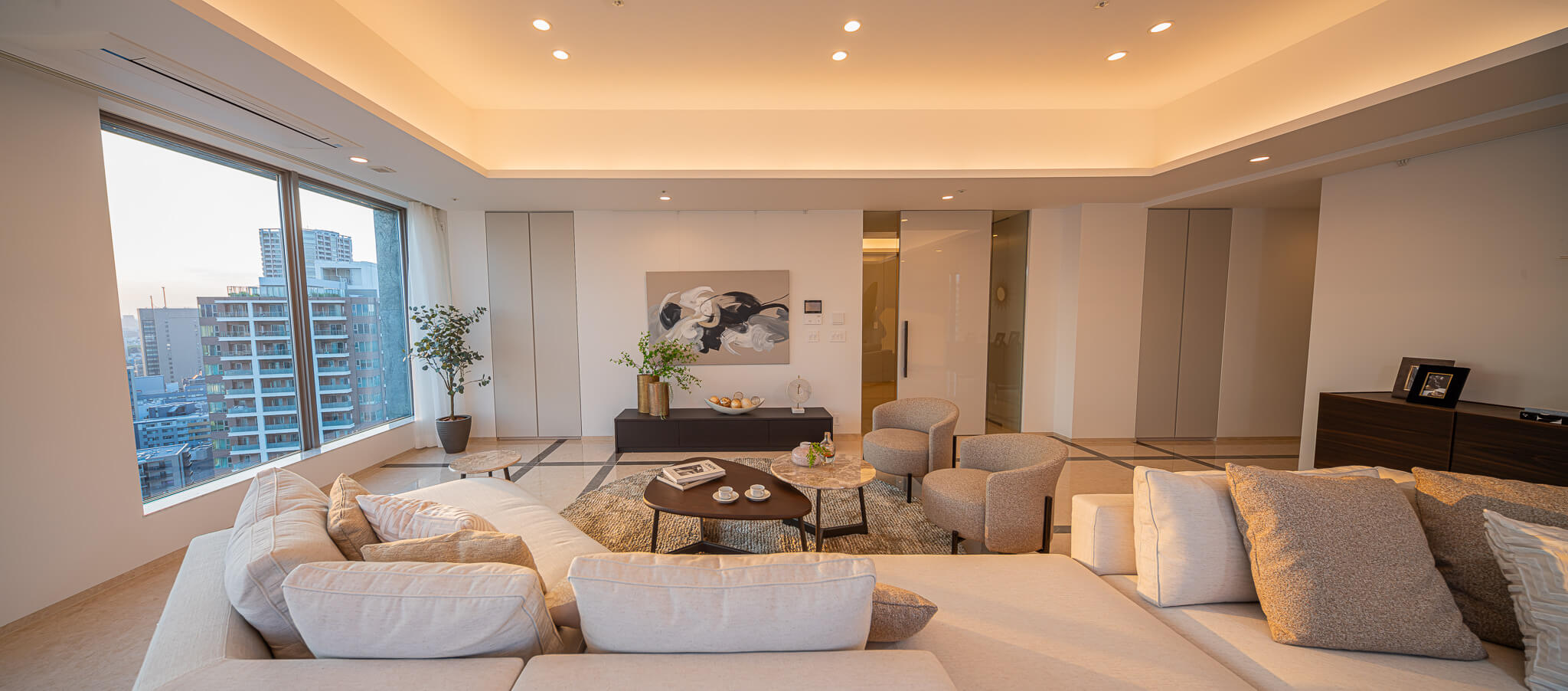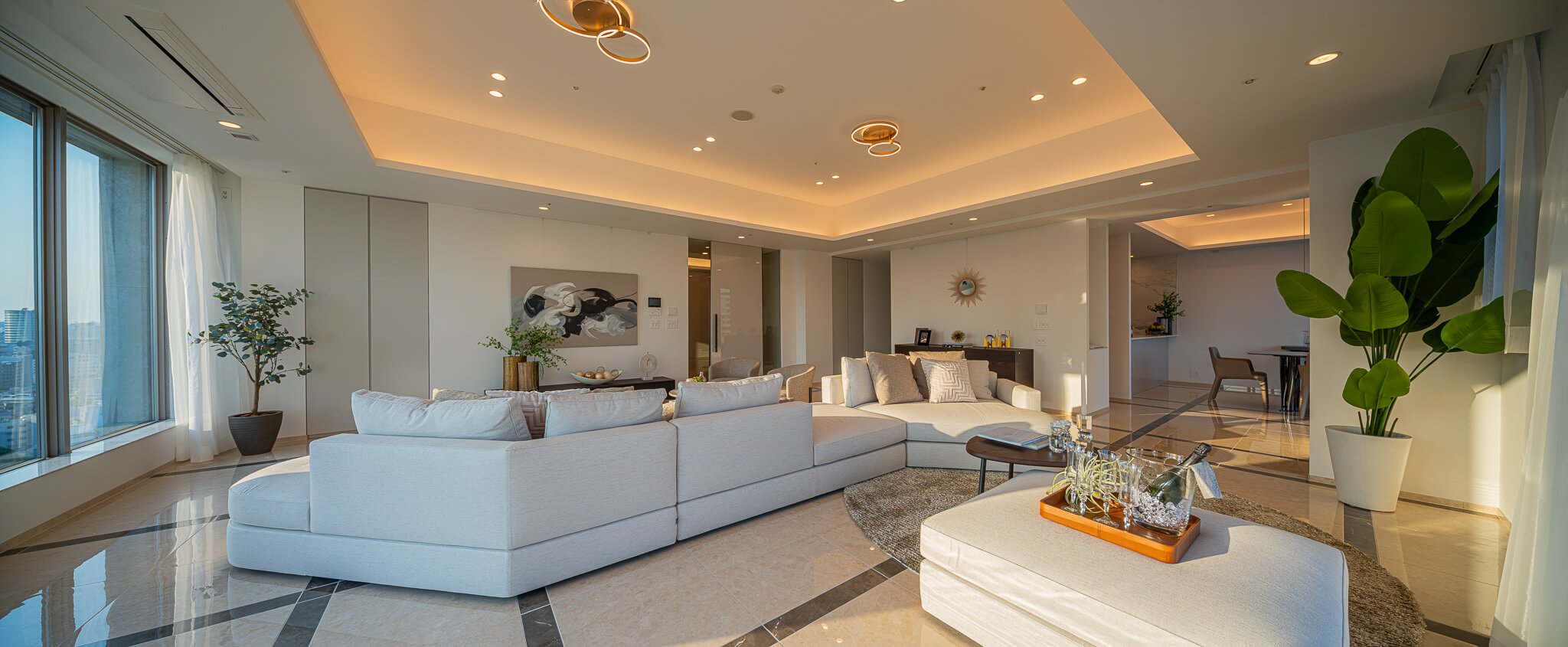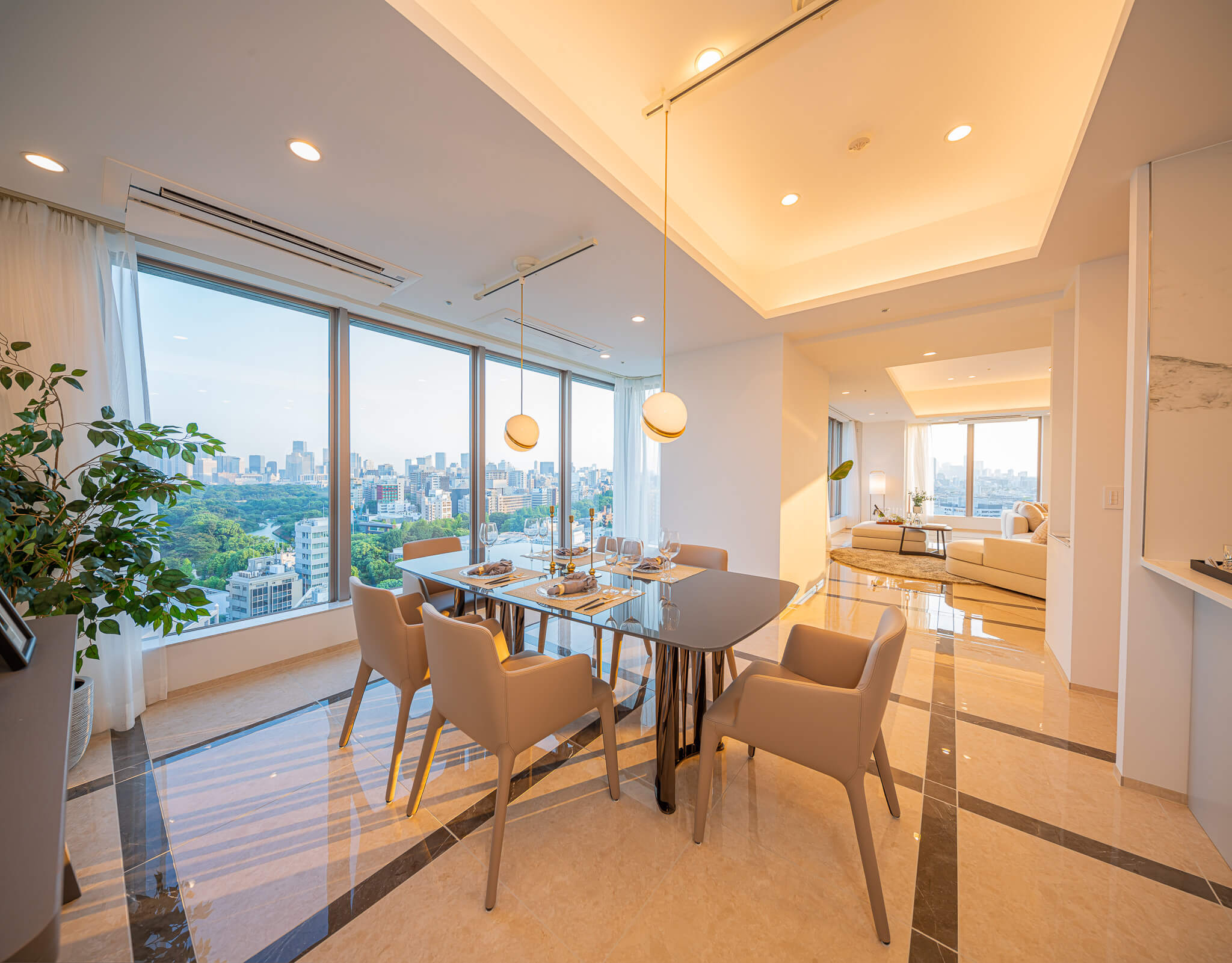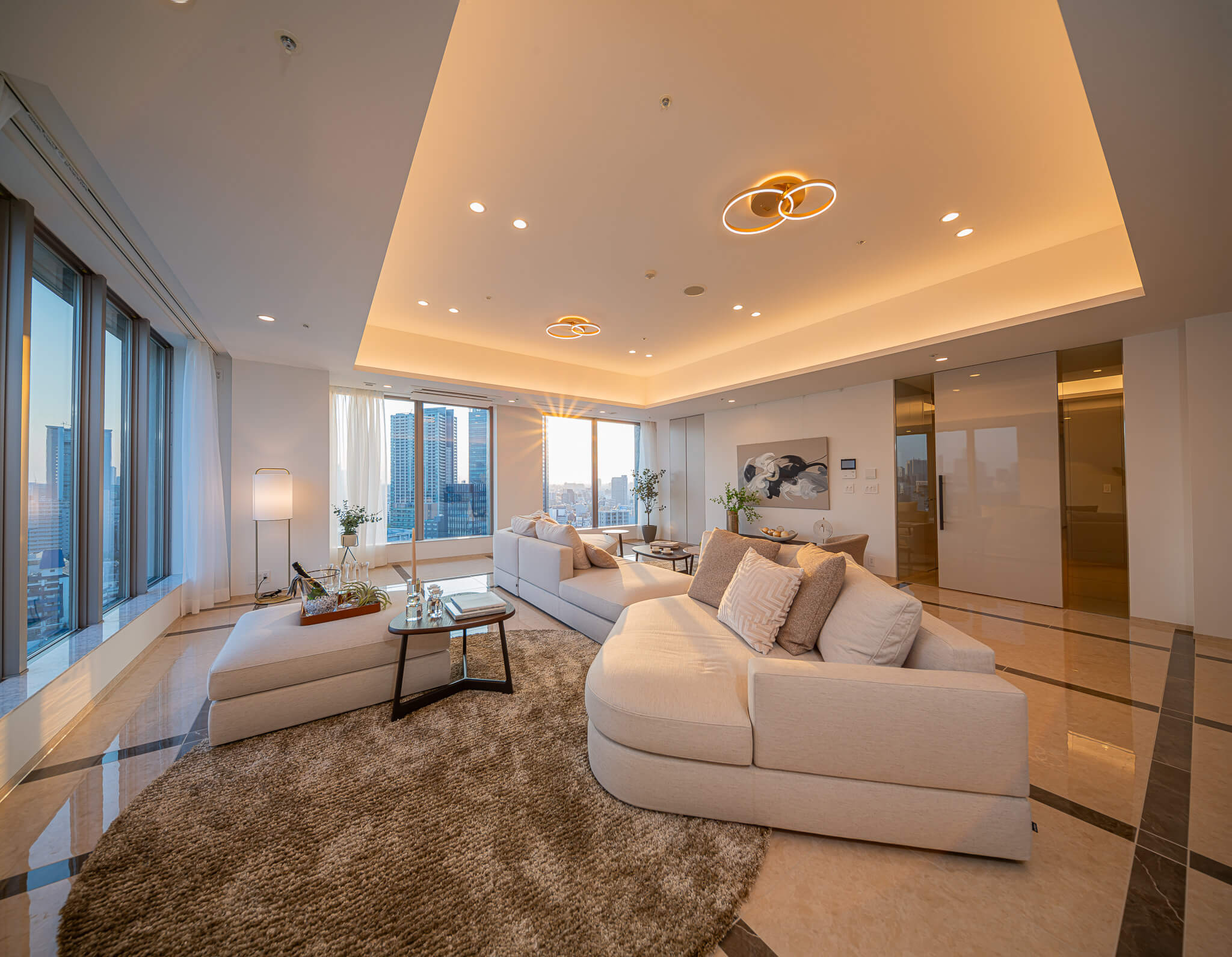 リビングダイニング約34.5帖、ダイニング約13.8帖の大空間。家具の配置も自由自在でゲストを招いてホームパーティーなども楽しめます。ホテルライクな折り上げ天井には間接照明が施されており、やさしい光で空間を照らしてくれます。また、壁をキズ付けずにアートや写真が飾れるピクチャーレールも設置されています。