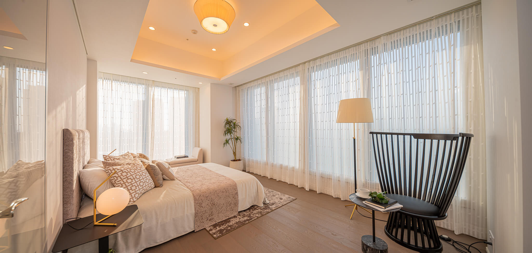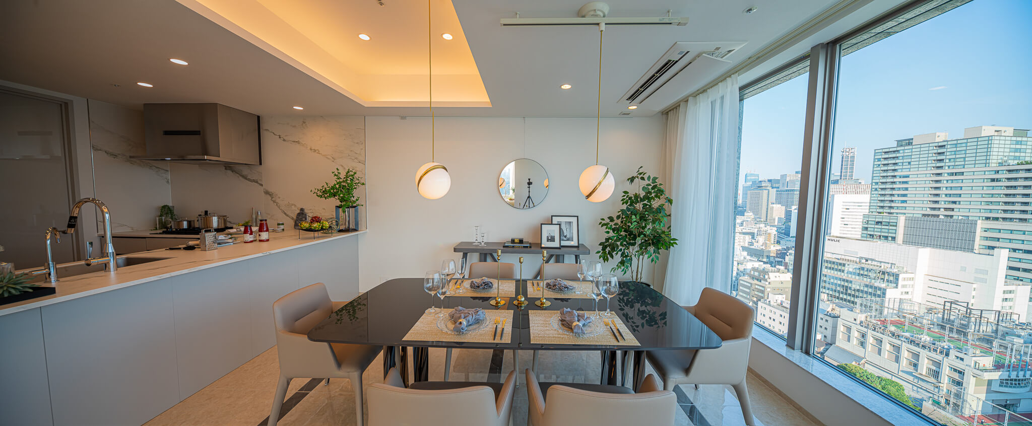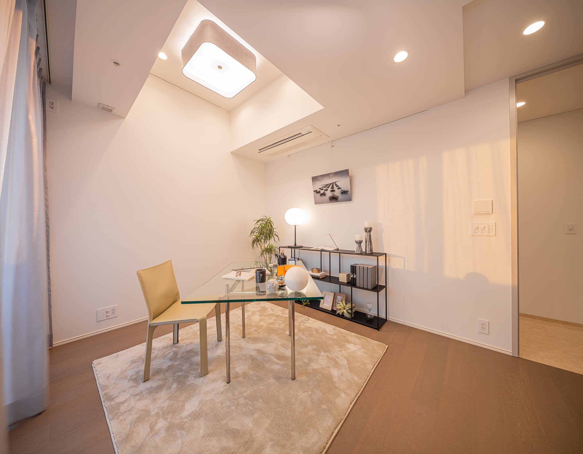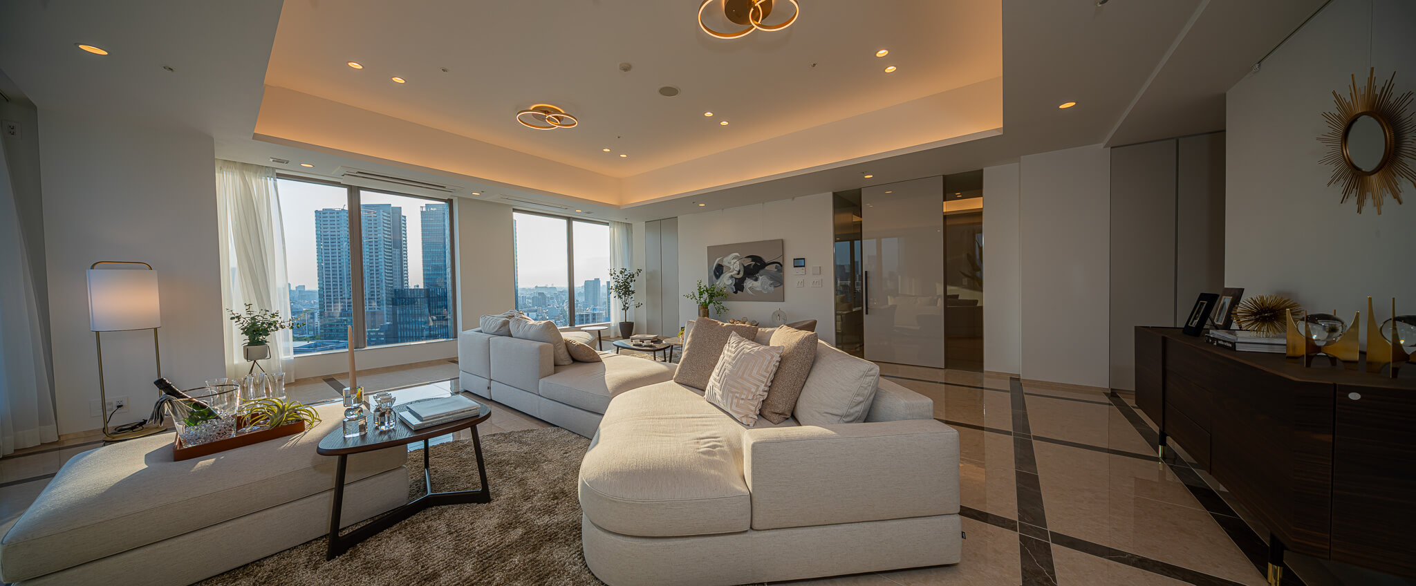 リビングダイニング約34.5帖、ダイニング約13.8帖の大空間。家具の配置も自由自在でゲストを招いてホームパーティーなども楽しめます。ホテルライクな折り上げ天井には間接照明が施されており、やさしい光で空間を照らしてくれます。また、壁をキズ付けずにアートや写真が飾れるピクチャーレールも設置されています。