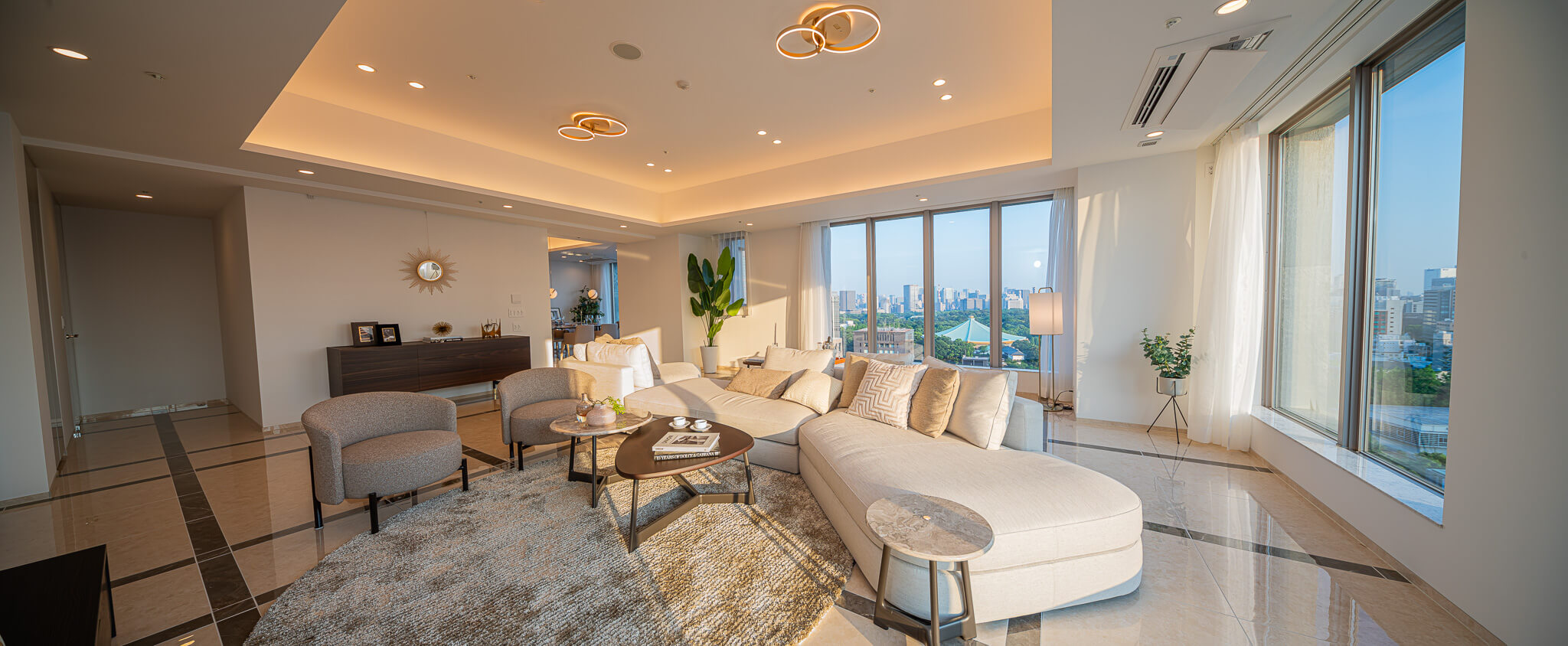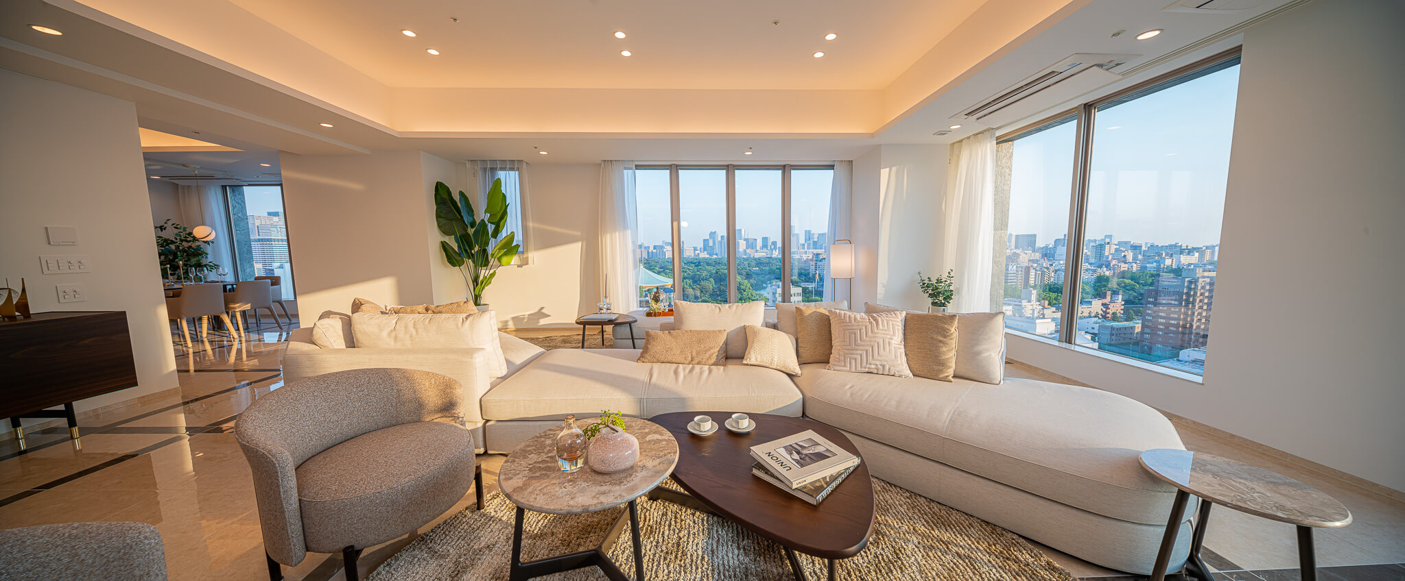 東京メトロ東西線・半蔵門線・都営新宿線「九段下」駅から徒歩5分。今回ご紹介する物件は建築家の隈研吾監修の高級レジデンス。お部屋は17階部の高層階、約210㎡の3LDKです。リビングだけで約34帖の大空間。南西向きの二面採光で開放感をたっぷりと感じられます。室内からでも眺望良好。ビル群と皇居の緑が望めます。各洋室にWIC(ウォークインクローゼット)、パントリー、SIC(シューズインクローゼット)付きで収納スペースも充実しています。