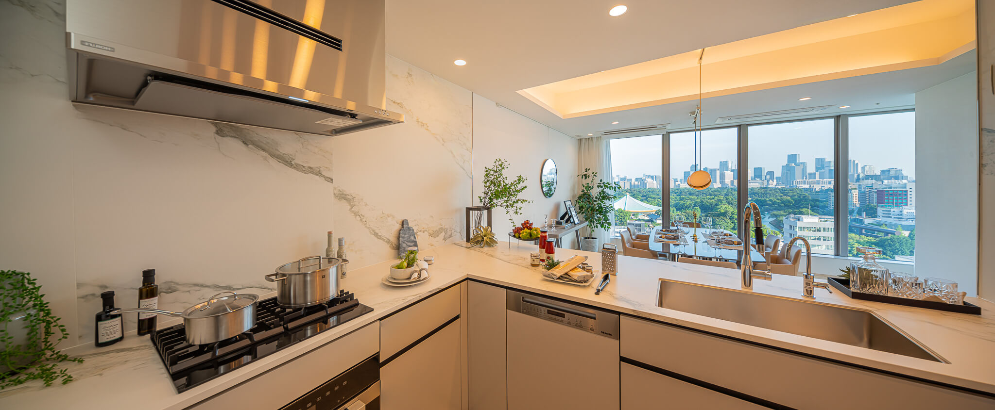 ダイニングや眺望を眺めながら料理が楽しめる対面型のシステムキッチン。L字型で作業スペースも広々使えます。料理が捗る3口ガスコンロ、家事の時短に心強い食洗機、ビルトインコンベック付きで設備も充実。キッチン奥には約3.5帖のパントリーが設置されており、収納スペースがしっかりと確保されています。パントリーはサブエントランス(勝手口)からも出入りできる便利な動線です。