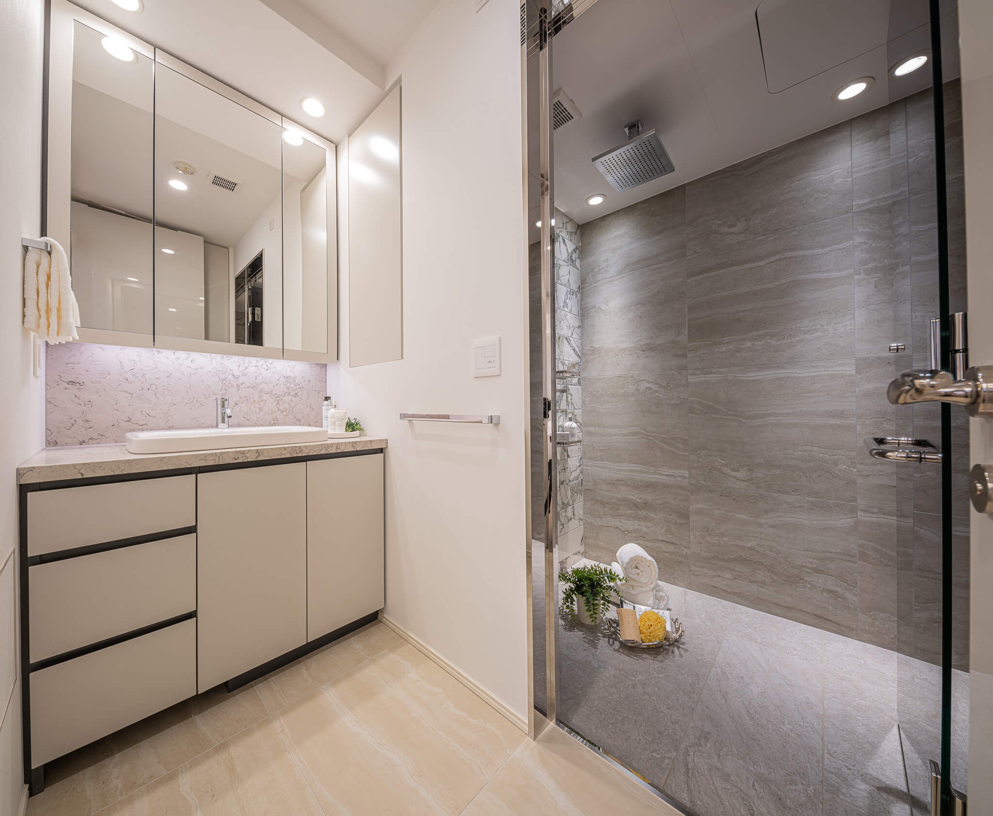 洋室1専用の洗面室とシャワールームを完備。シャワールームにはオーバーヘッドシャワーが備わっています。