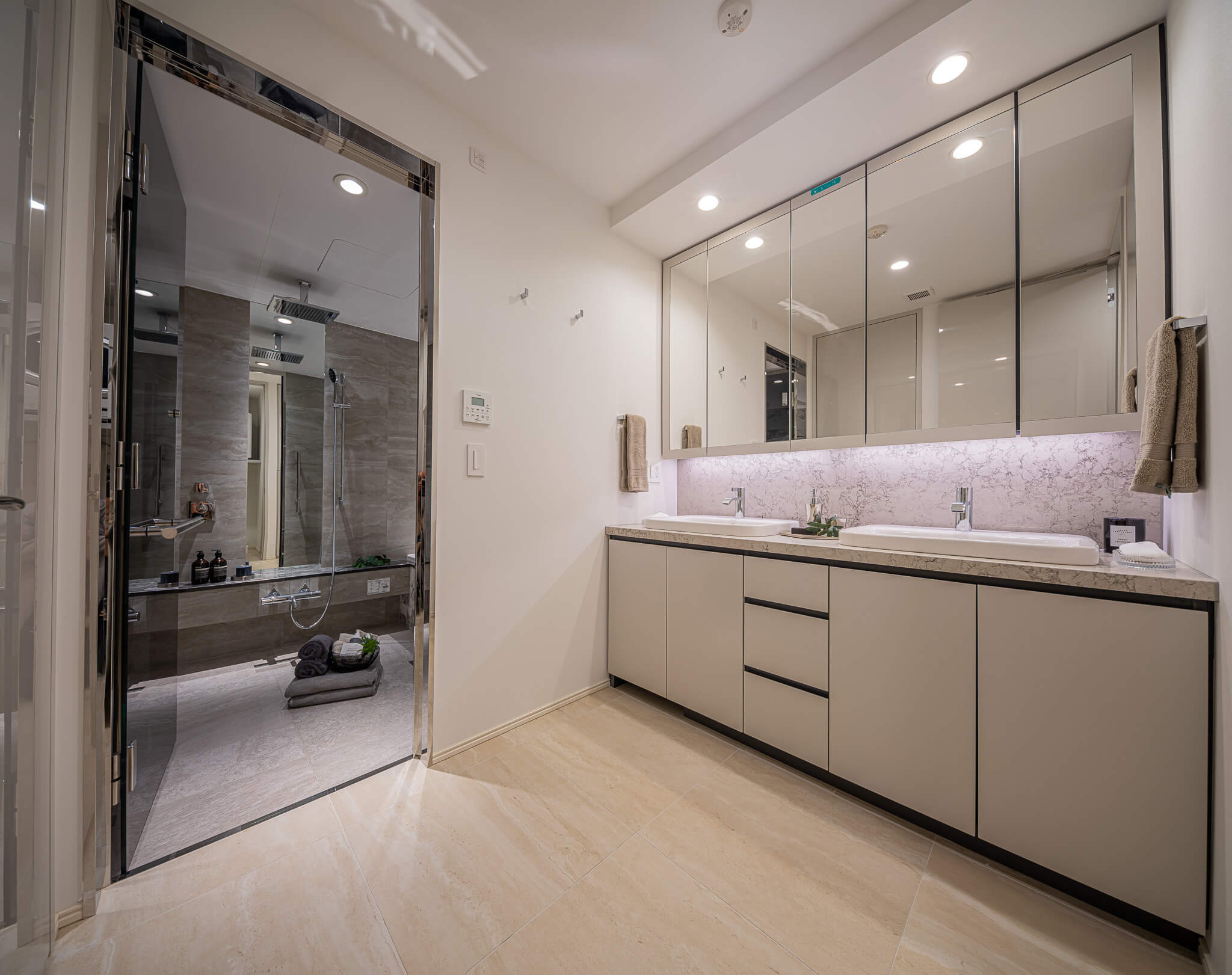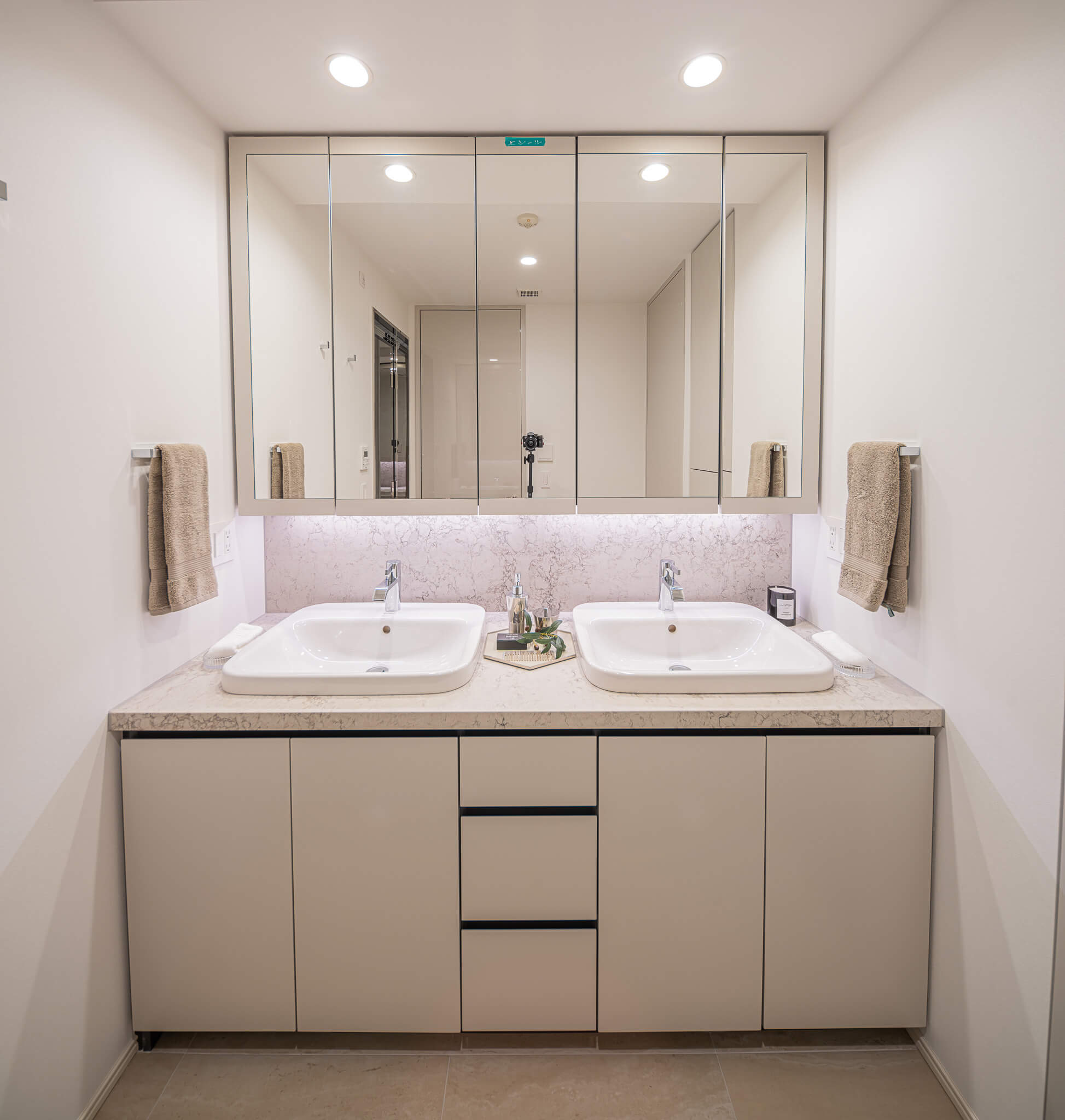 ホテルライクな2ボウルの洗面化粧台。家族で使用時間が重なってもそれぞれゆっくり使えます。洗面まわりの小物がすっきり整頓できるミラーボックス、洗面下キャビネット、リネン庫付きでいつでも整った状態をキープできそうです。