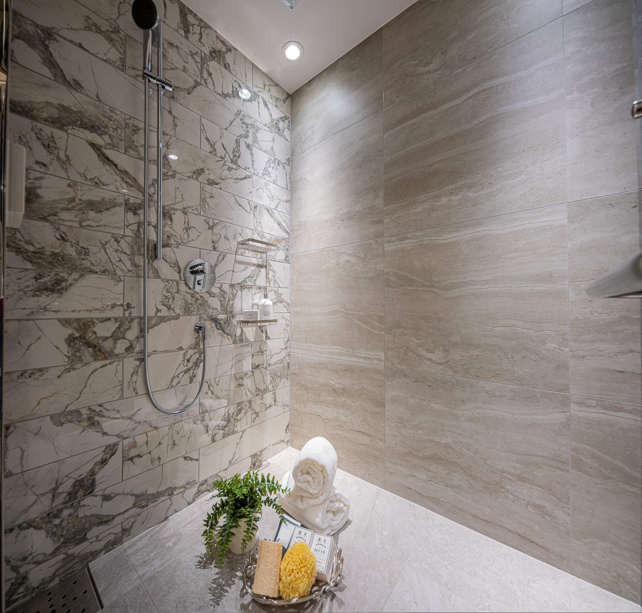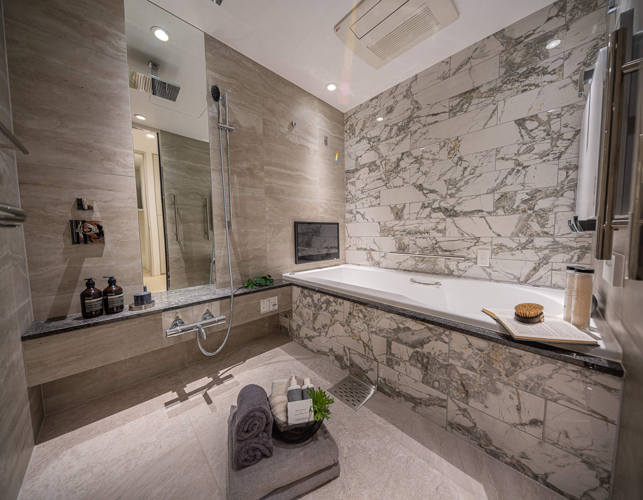 1822サイズのゆとりある広さのバスルーム。2種類の石目調のタイル貼りで、重厚感と上質な雰囲気が感じられるデザインです。浴室換気乾燥機、浴室テレビも備わっています。