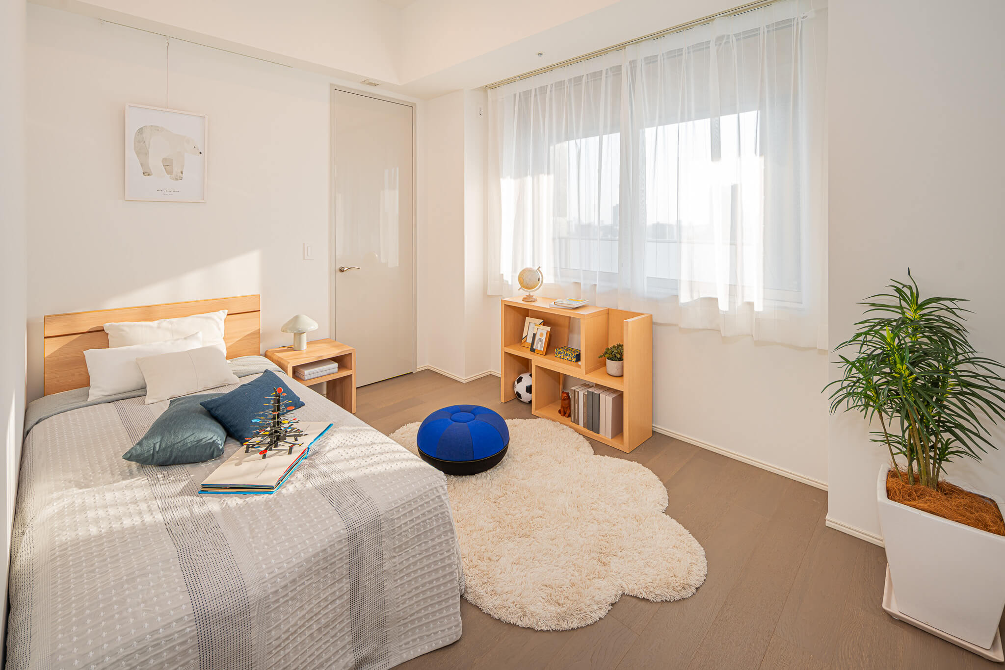 約7.0帖の洋室2。洋室は全て廊下に面した独立性の高い空間で、自分時間をゆっくりと過ごせます。こちらは夕方まで明るさが続く西向きで、バルコニーへの出入りも可能です。ピクチャーレール付きで壁をキズ付けずにアートや写真が飾れます。WIC(ウォークインクローゼット)も備わっています。
