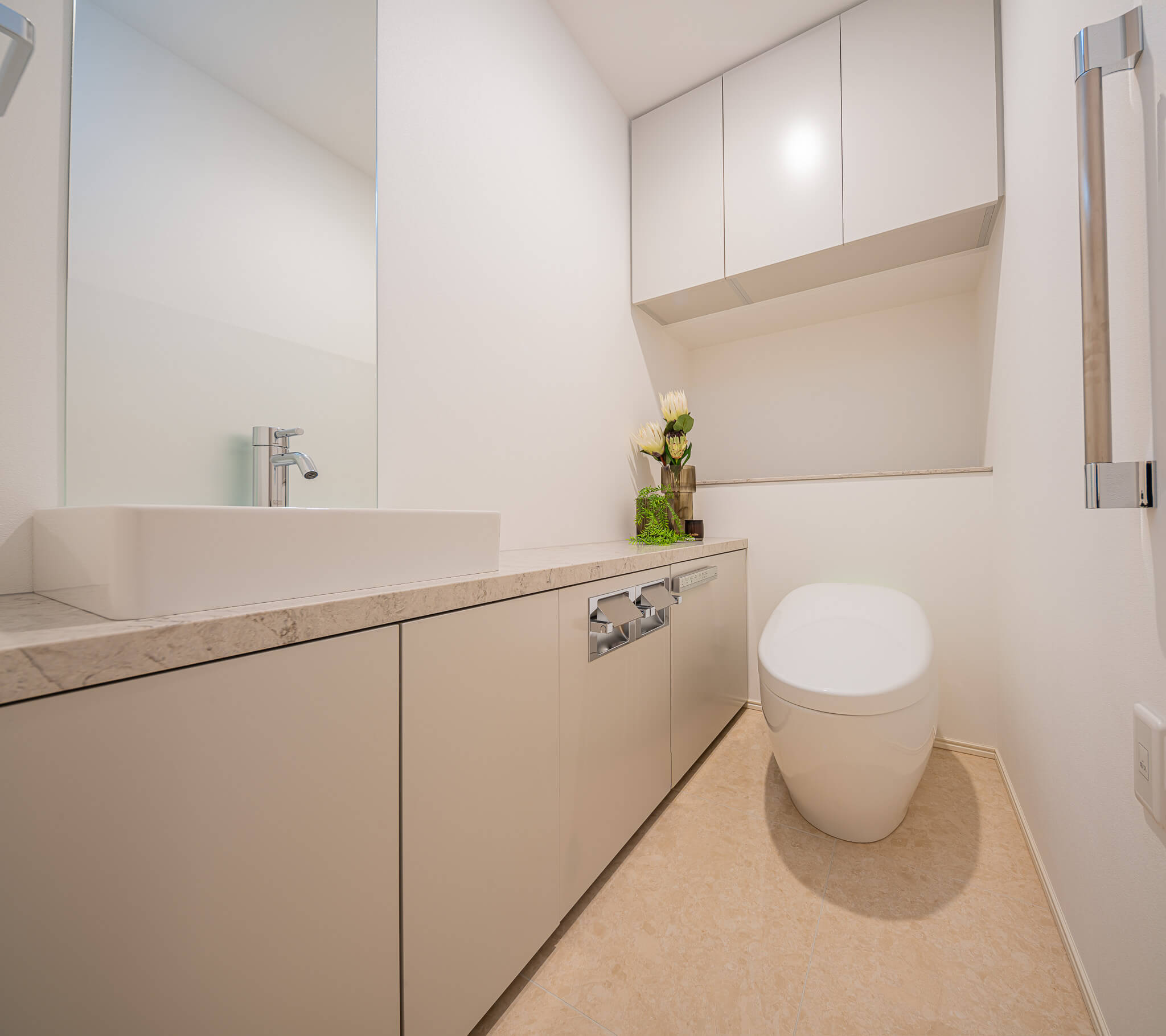 廊下に面したレストルーム。空間がすっきり見えるタンクレストイレ。独立型の手洗い器、ウォシュレット、収納スペースも備わっています。