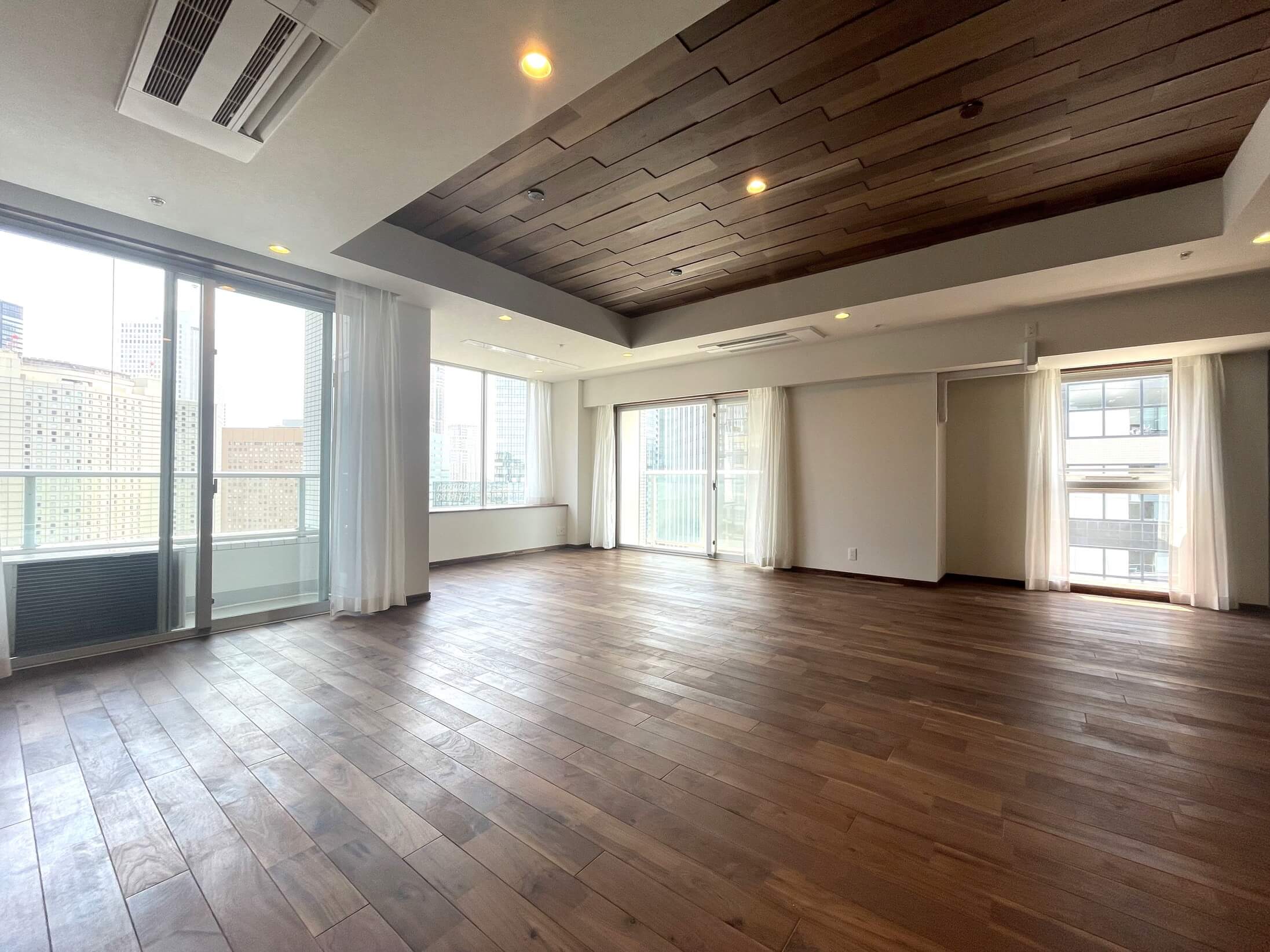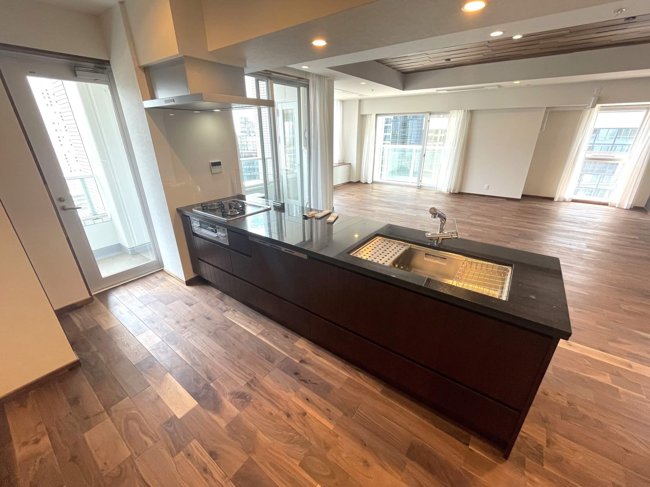 キッチンスペースを含め、約32.5帖のLDK。家族でゆったり過ごせ、ゲストを招いて食事会なども楽しめます。二面採光で開放的、室内から都心のビル群が望めます。フローリングは天然無垢材を使用。重厚感のあるこげ茶色が特徴的、衝撃に強く耐久性にも優れています。