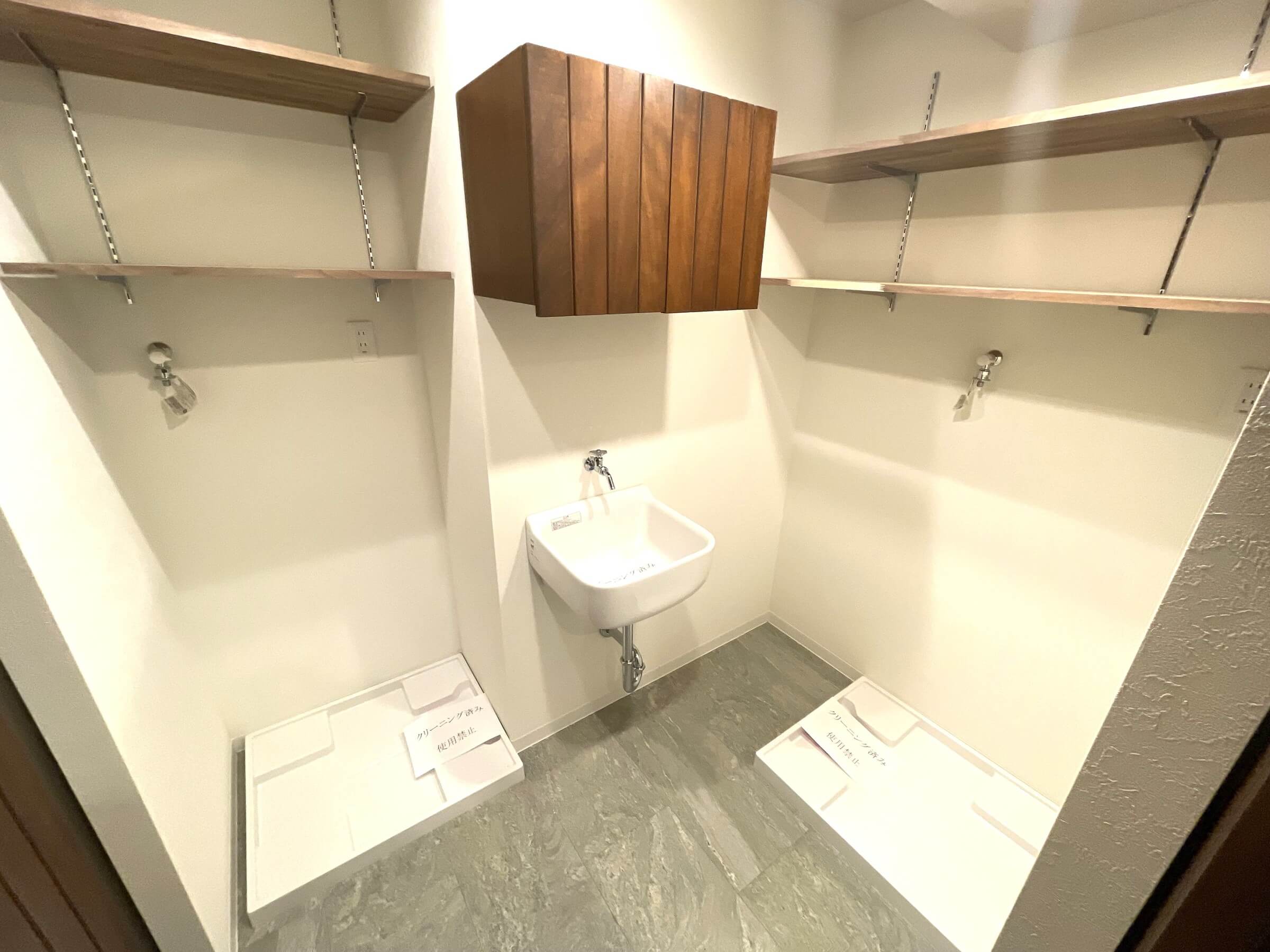 キッチン横にはユーティリティスペースを完備。洗濯機が2台おける広さで、スロップシンクも付いています。靴などの手洗い場に便利です。