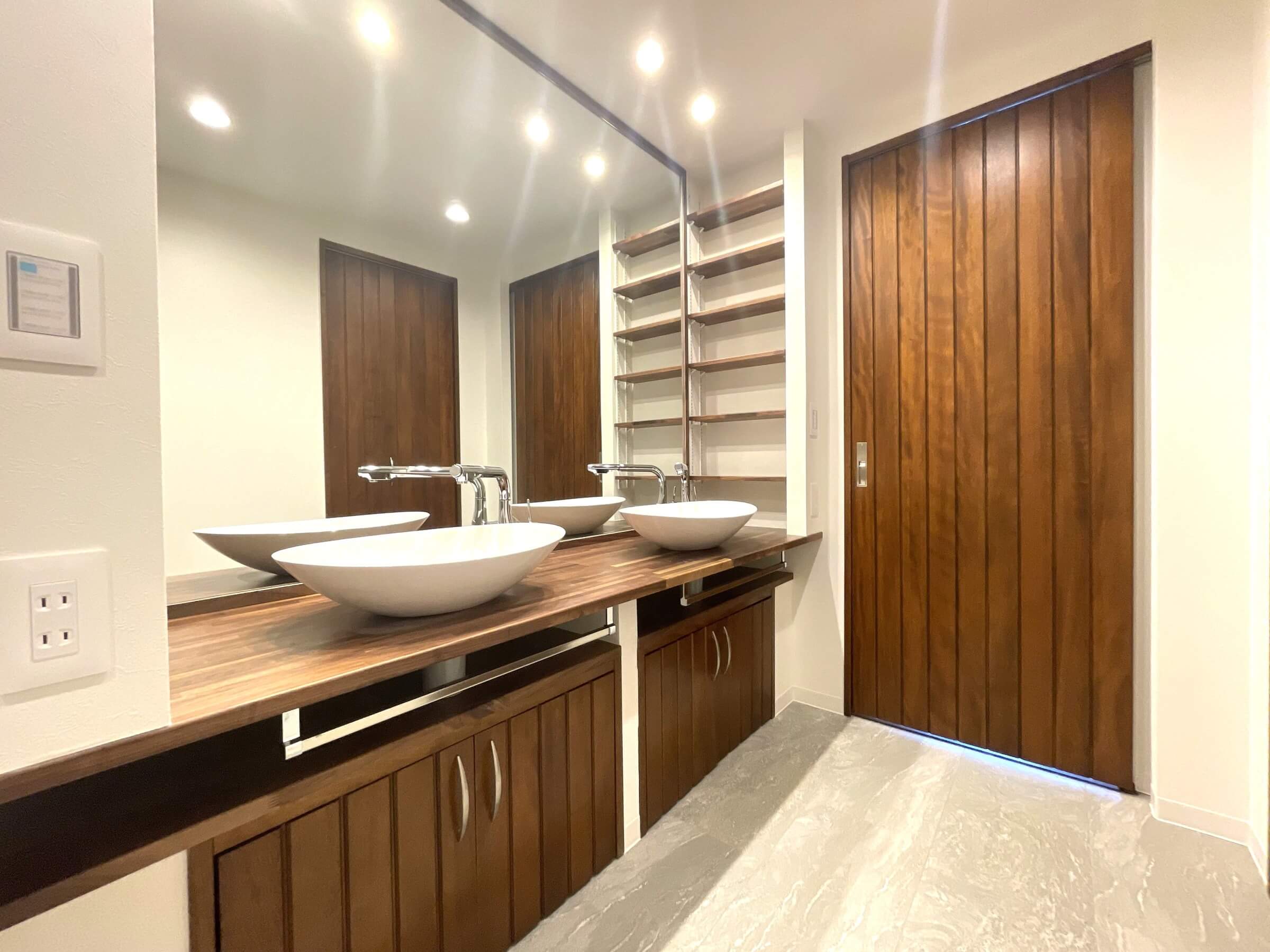 ホテルライクな2ボウルの洗面化粧台。家族で使用時間が重なってもそれぞれゆっくり使えます。継ぎ目のない大きな鏡でデザイン性も◎。洗面化粧台の両サイドには可動棚も付いています。