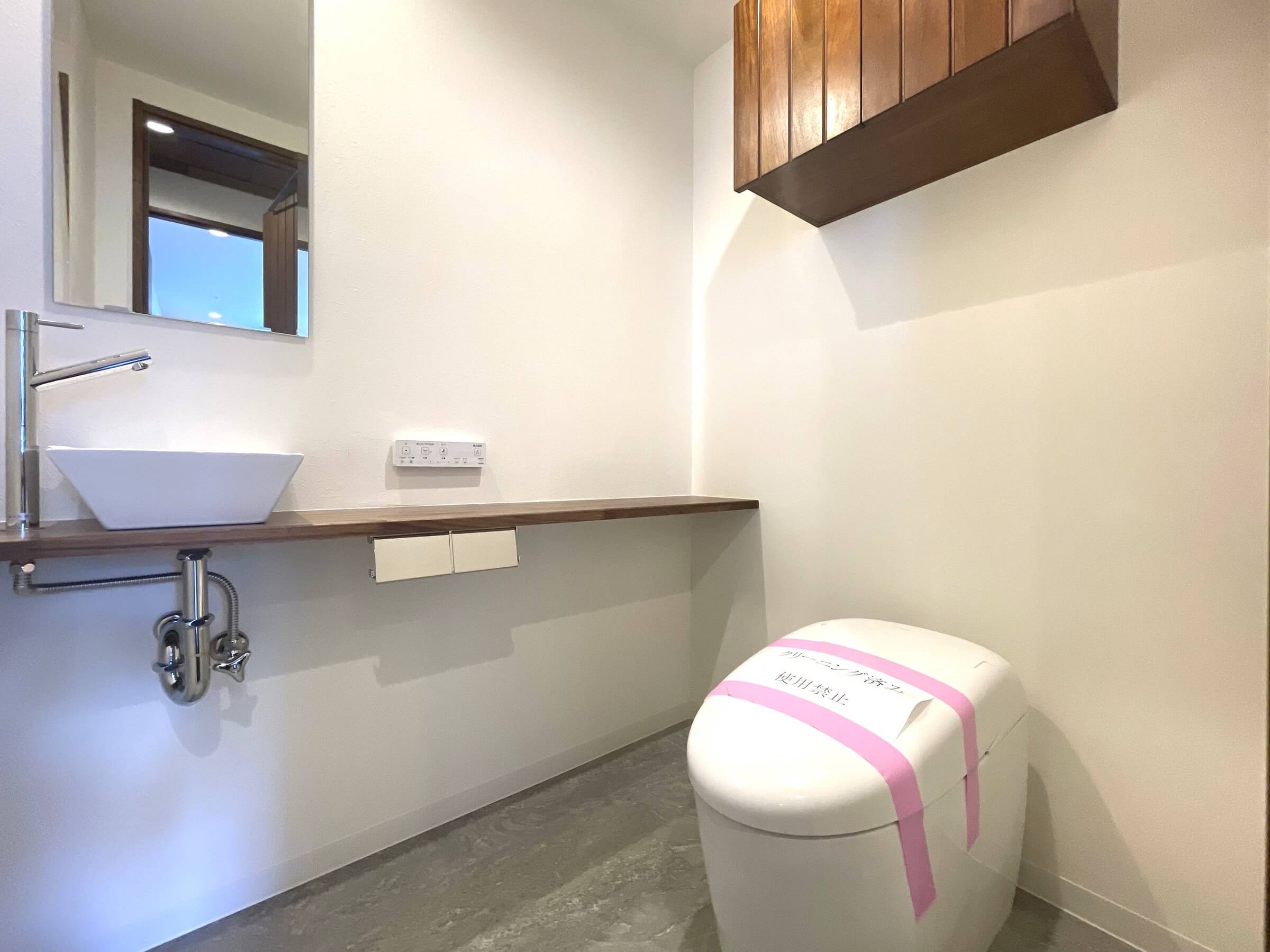 トイレは洗面室と廊下の2ヵ所に設置されています。写真は廊下側のトイレ。空間がすっきり見えるタンクレストイレを採用。独立型の手洗い器、収納スペース、ウォシュレットも備わっています。