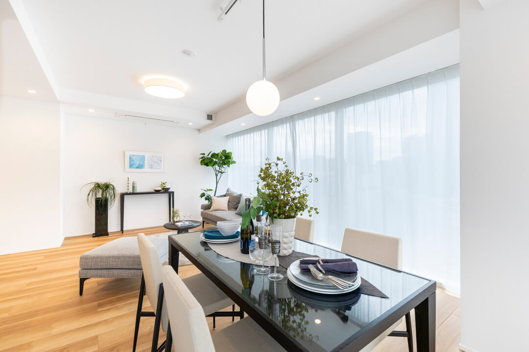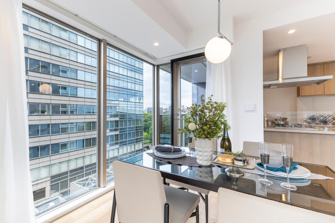 約19.0帖のLDK。南・西・北の3面に大開口の窓が並び、開放感溢れる空間です。北側に小石川後楽園、南側には神田川が流れ、都心の中に自然を感じることができますよ。