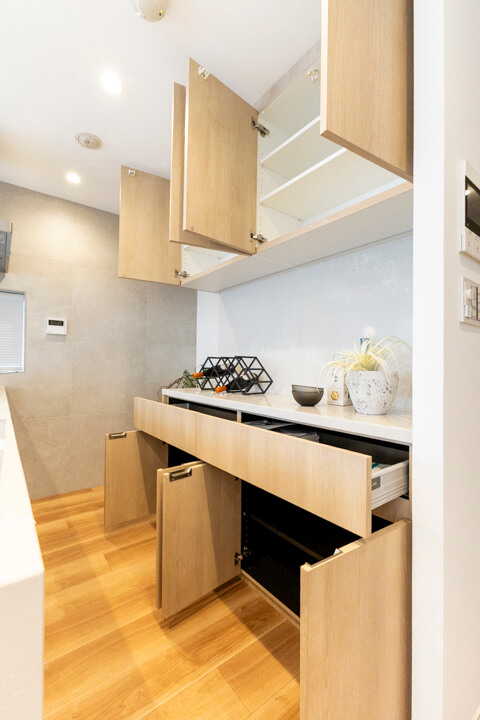 背面には収納力のあるカップボードを完備。キッチンと同じデザインで統一感があります。食料品のストックや食器類を整理整頓でき、ごちゃごちゃしがちなキッチンまわりがすっきり片付きそうですね。カウンターにはコンセントが付いているので、キッチン家電の使用スペースとしても活躍しそうです。