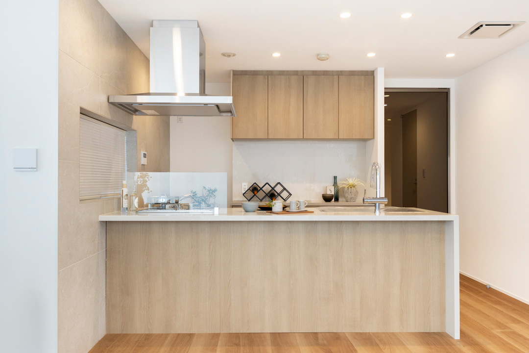 木目デザインがお部屋に馴染むキッチン。タイル壁が洗練された印象を醸し出します。人気の対面タイプで、開放的な気分で調理ができます。家族のコミュニケーションも増えそうですね。