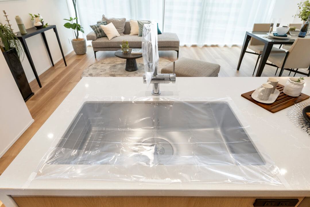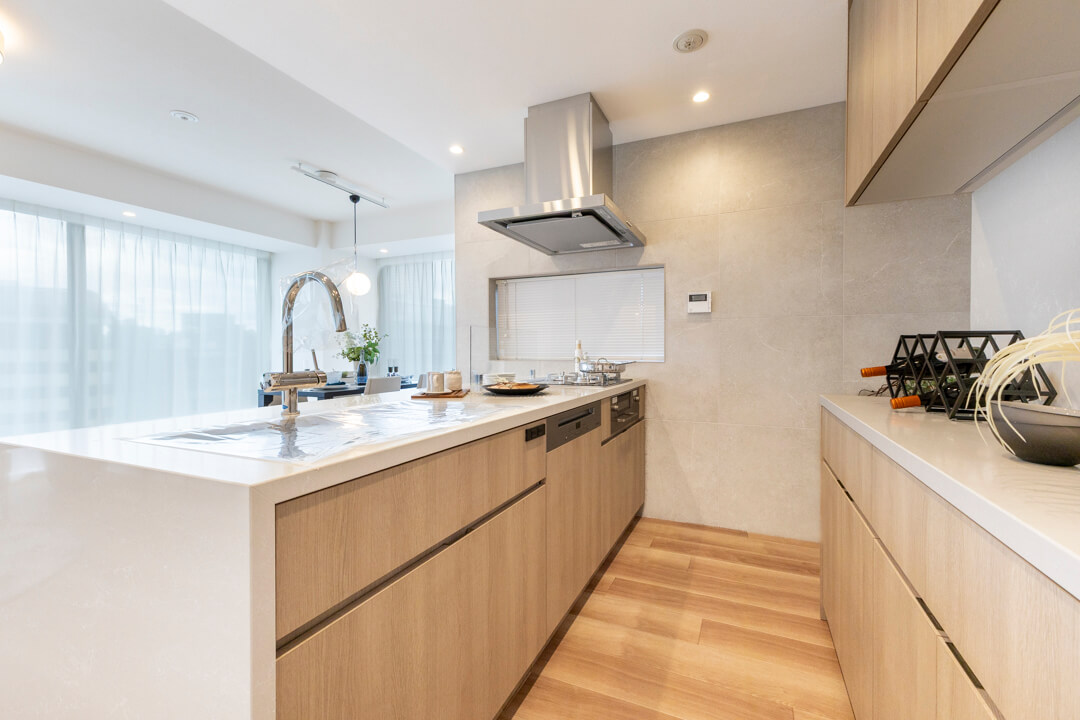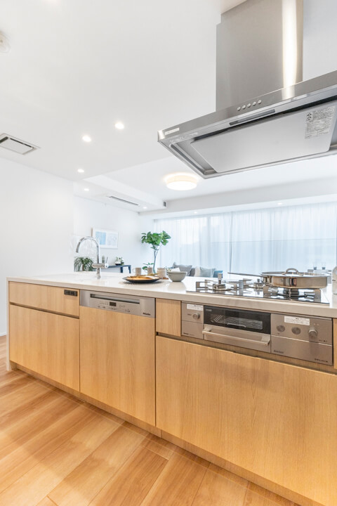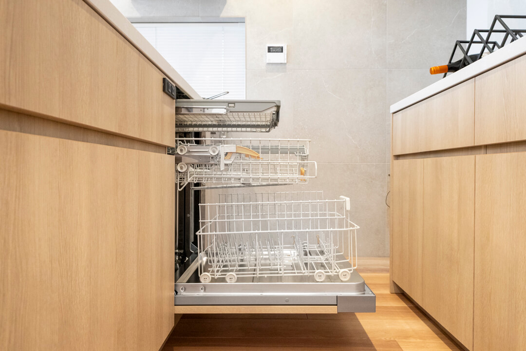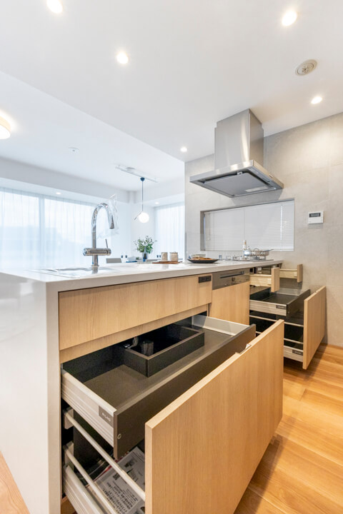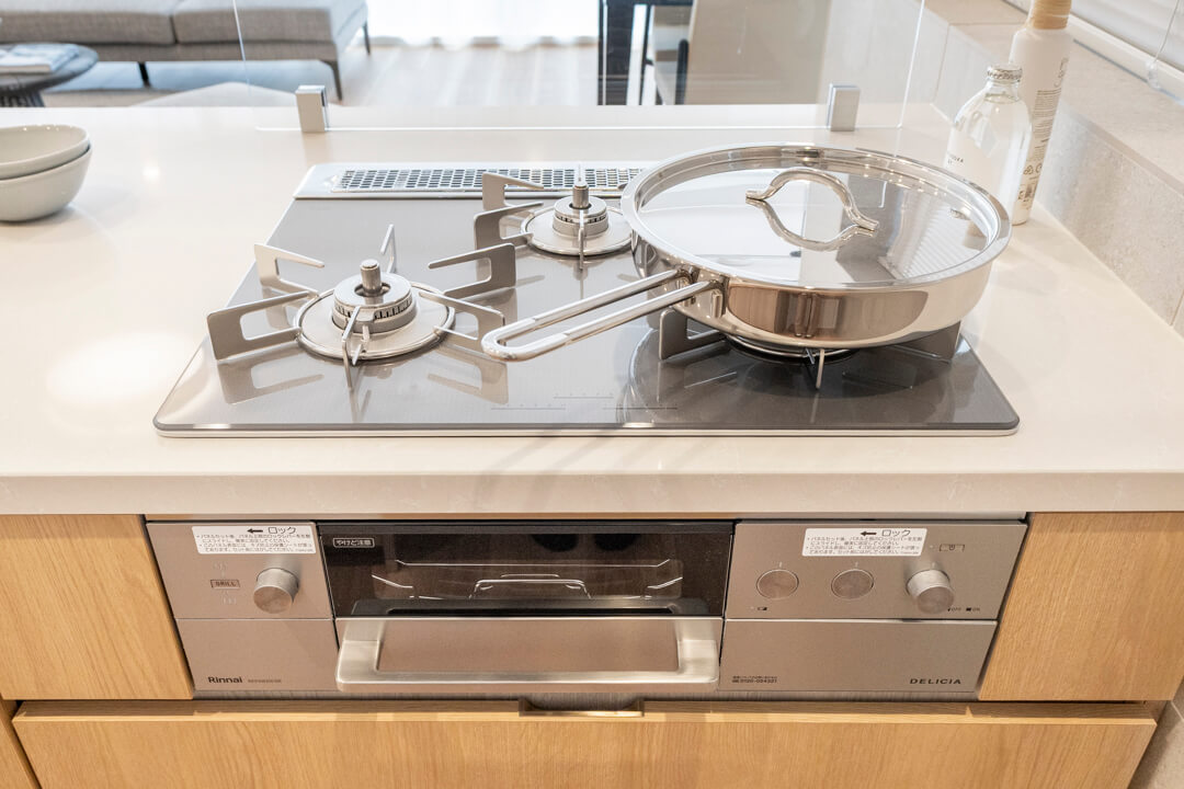 効率良く調理ができるグリル付3口ガスコンロや、後片付けの捗るMiele(ミーレ)製の大容量食洗機を内蔵。さらに、シンクにはディスポーザーが付いています。料理後すぐに生ゴミを処理できるので、掃除の手間が軽減され、悪臭の原因を防いでくれます。