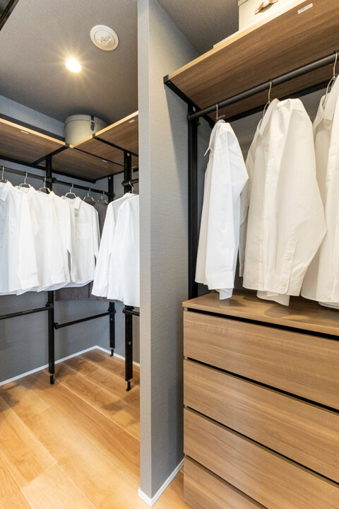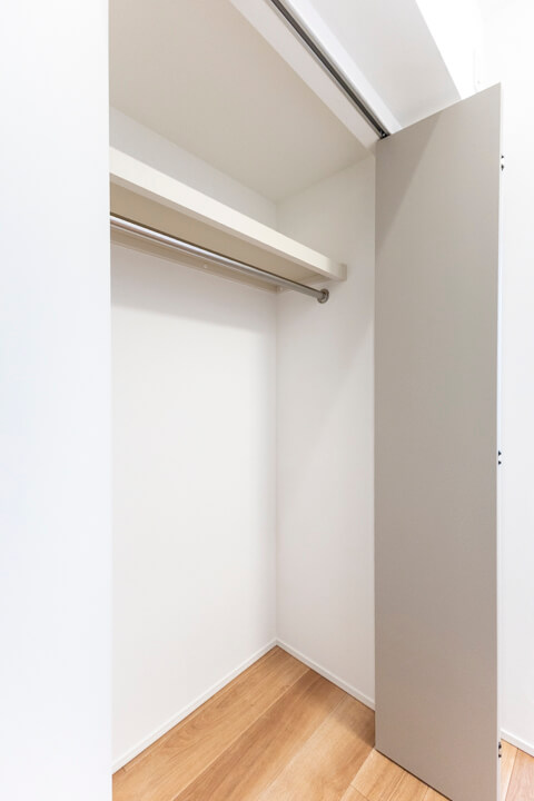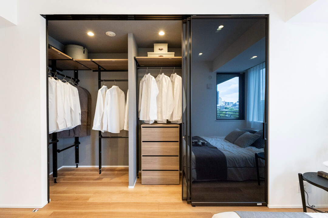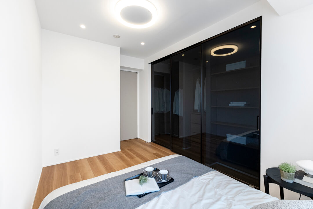 収納面では、約1.8帖のWIC(ウォークインクローゼット)を完備。大切な洋服をたっぷり収納でき、居室空間を有効活用できそうです。ブラックのスライドドアがスタイリッシュですね。