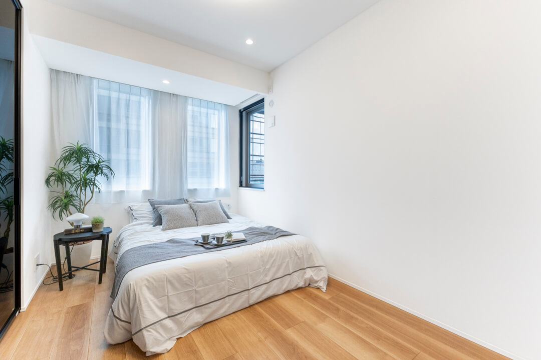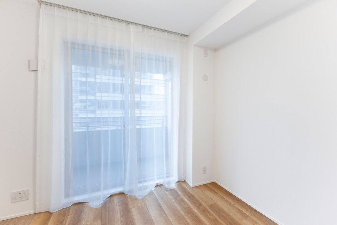 約6.2帖の洋室1。洋室で最も広く、主寝室におすすめです。2面採光で明るく、窓から木々の緑が見えるのも嬉しいポイントです。