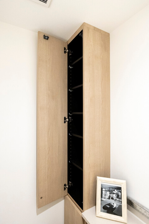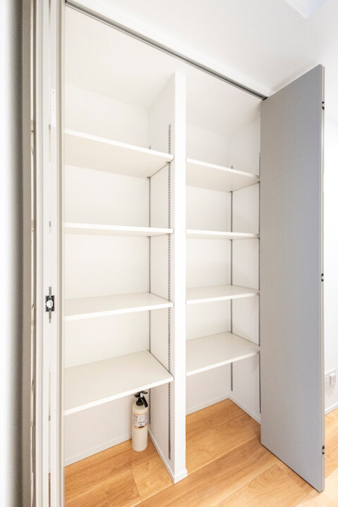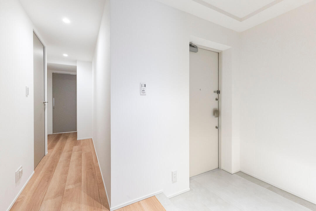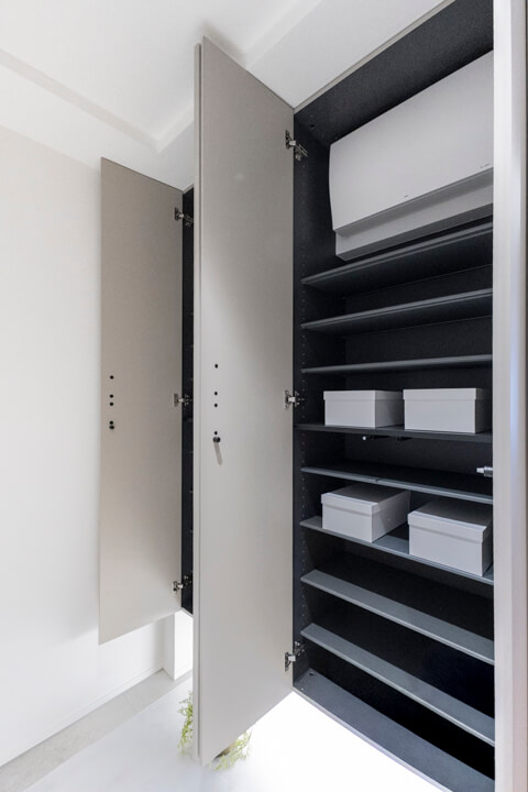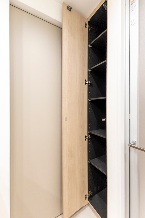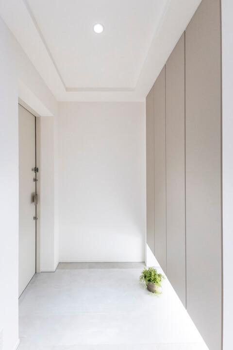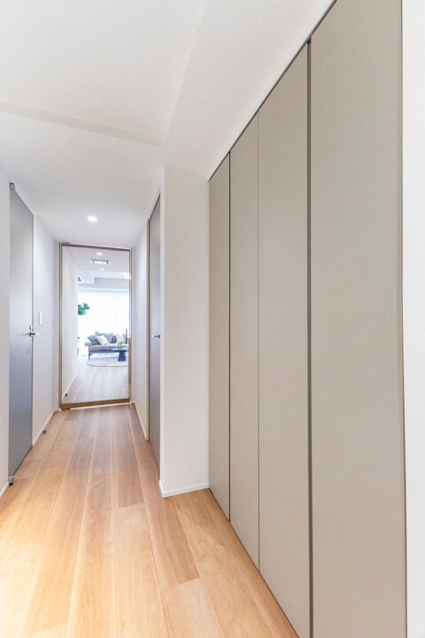 人感センサー搭載でいつも明るく出迎えてくれる玄関。荷物で両手が塞がっている時や夜遅く帰宅した時に、スイッチを探す手間がかからず助かります。入って正面にはトールタイプのシューズボックスがあり、散らかりがちな靴をすっきり収納可能。フットライトのやわらかな明かりが幻想的な雰囲気を演出します。廊下収納もあり、日用品ストックやペットグッズ等の収納に重宝しそうです。
