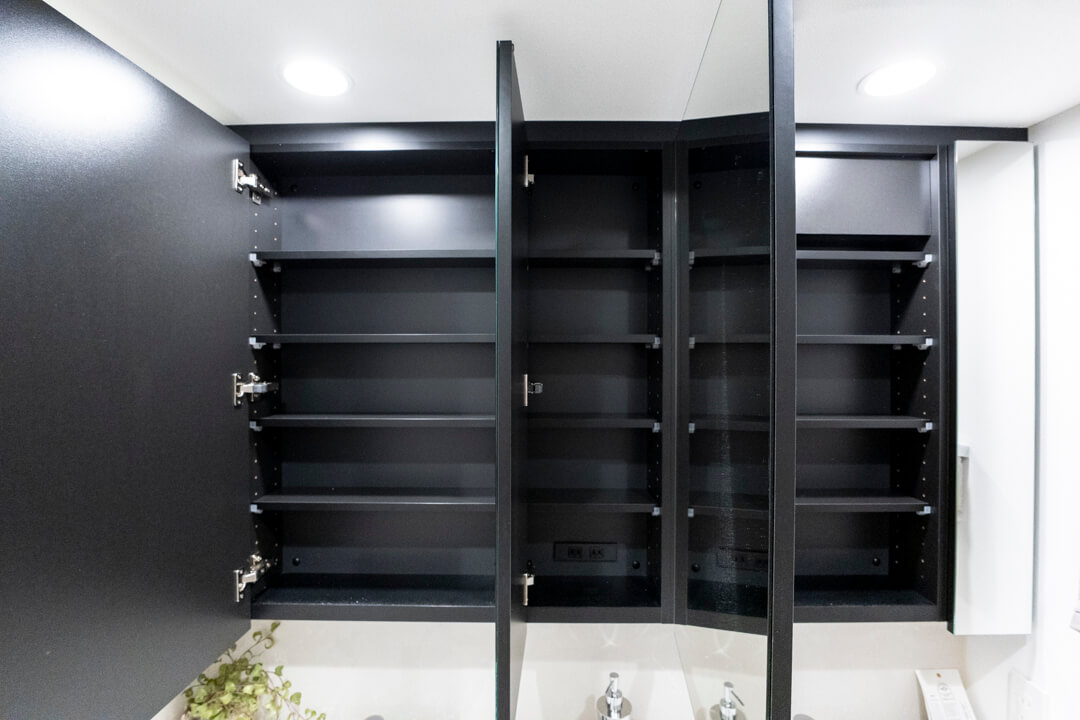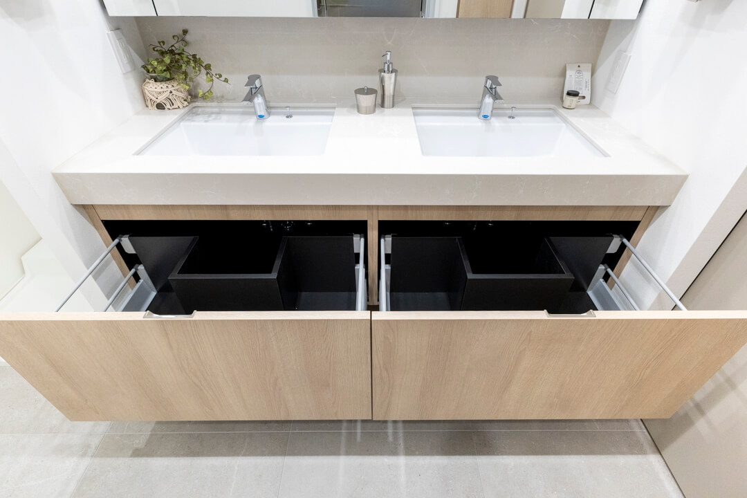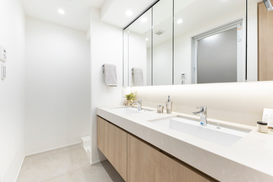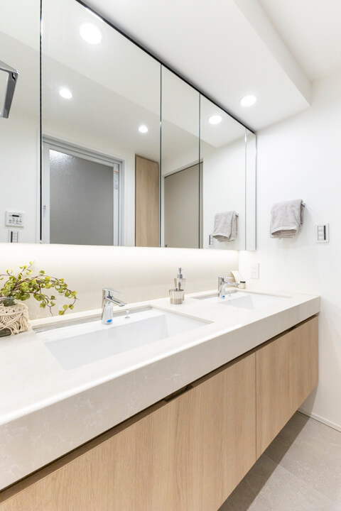 2つの洗面ボウルが並ぶ洗面化粧台。2人同時に使用でき、忙しい朝の身支度も安心です。間接照明が手元を明るく照らし、ホテルライクな雰囲気を演出します。大容量のミラーボックスに足元の引出し、リネン庫も付いていて豊富な収納が魅力的。いつも清潔な洗面室をキープできそうです。