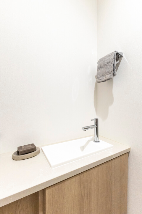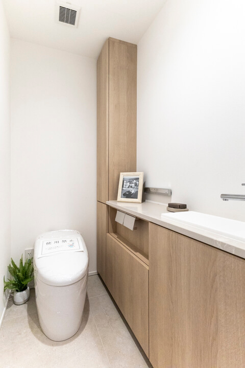 廊下に面していて独立性の高いレストルーム。TOTO製の洗浄便座付トイレに新規交換済みです。タンクレス仕様でスタイリッシュですね。奥には収納棚があり、トイレットペーパーや掃除用品をすっきり収納可能。手洗いカウンター付きですぐに手を洗うことができ、ゲストを洗面室まで案内する手間がかかりません。
