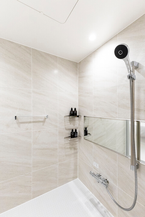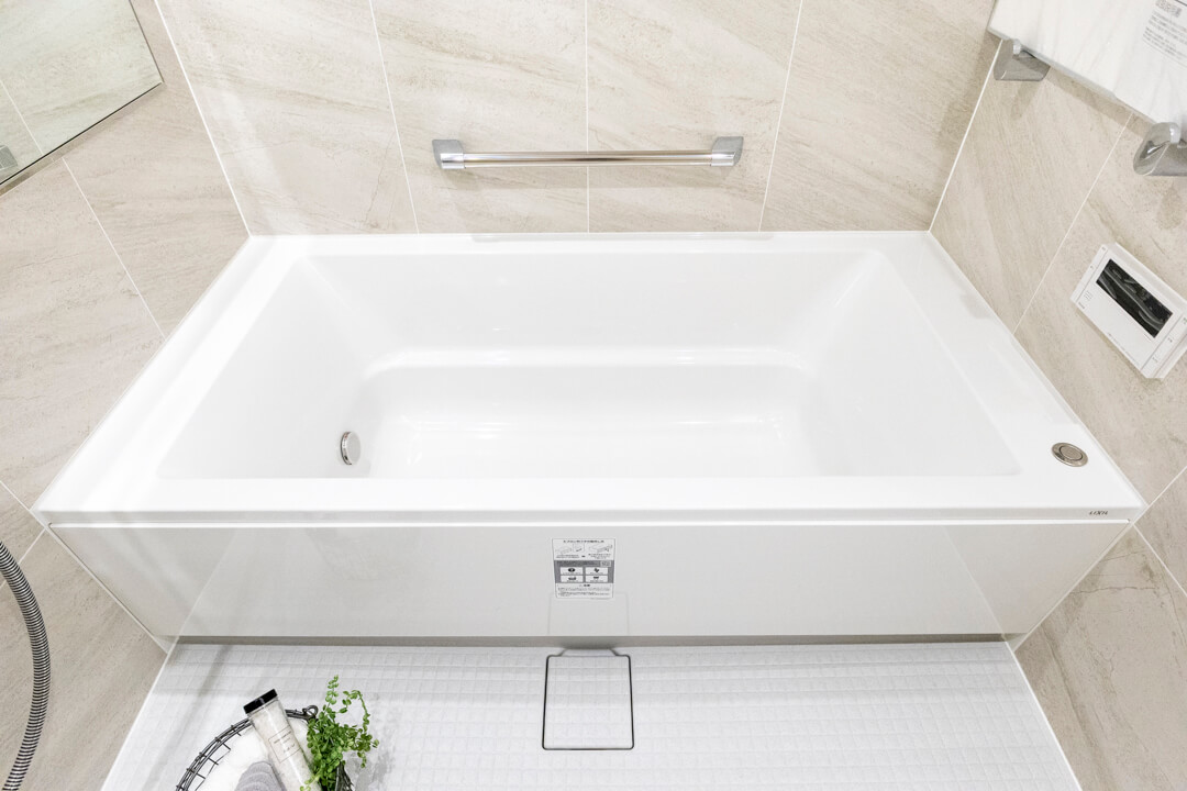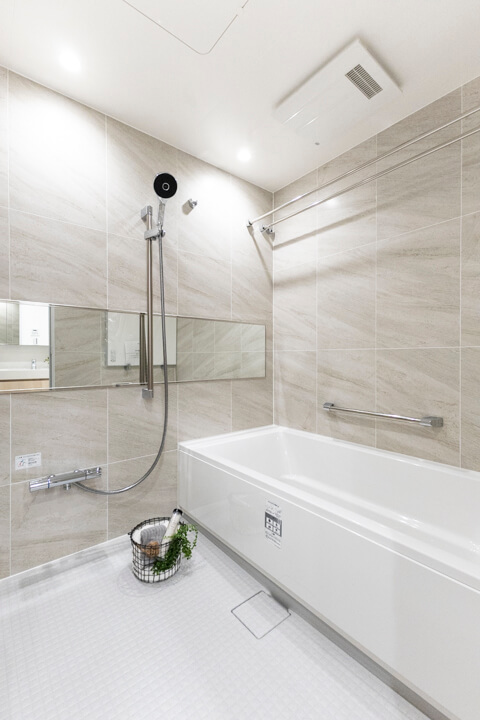 大理石調で高級感の漂うバスルーム。ワイドミラーが奥行きをもたらし、広々とした印象です。換気・暖房・乾燥・涼風機能付きで1年中快適なバスタイムに。雨の日の洗濯スペースとしても重宝しそうです。追い焚き機能も付いているので、家族の入浴時間がずれてしまった時、半身浴をしたい時に助かります。