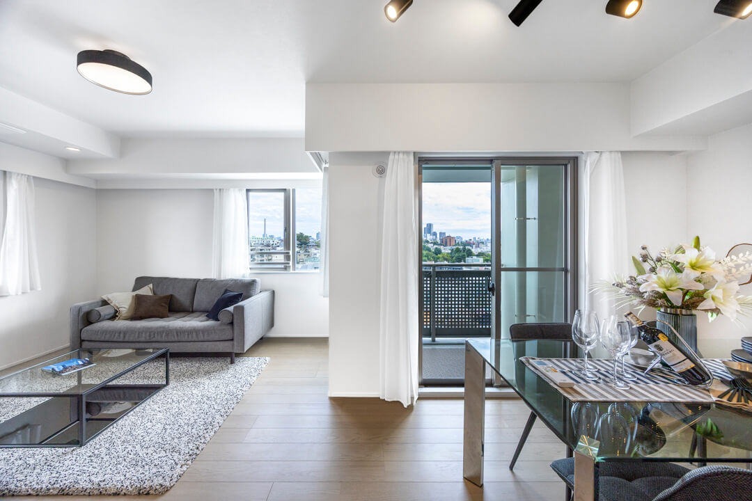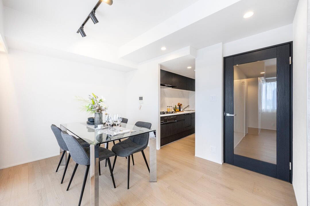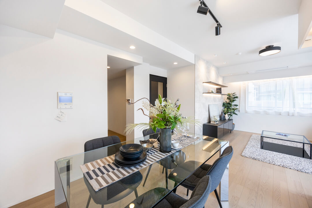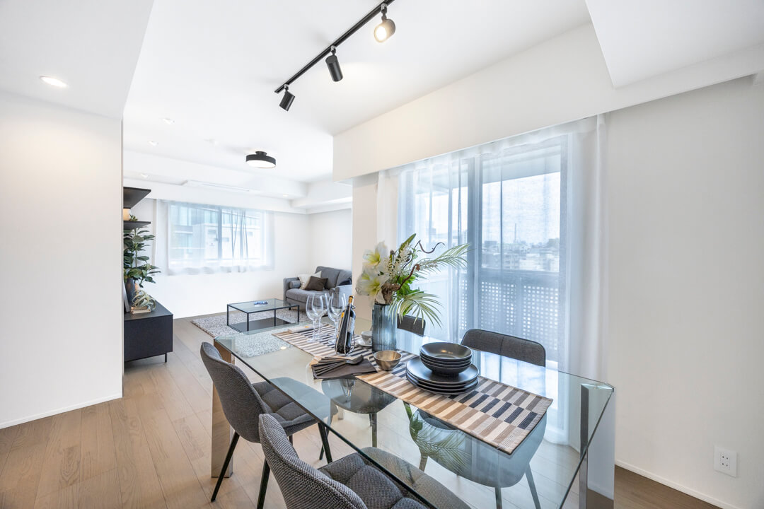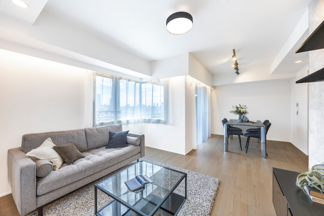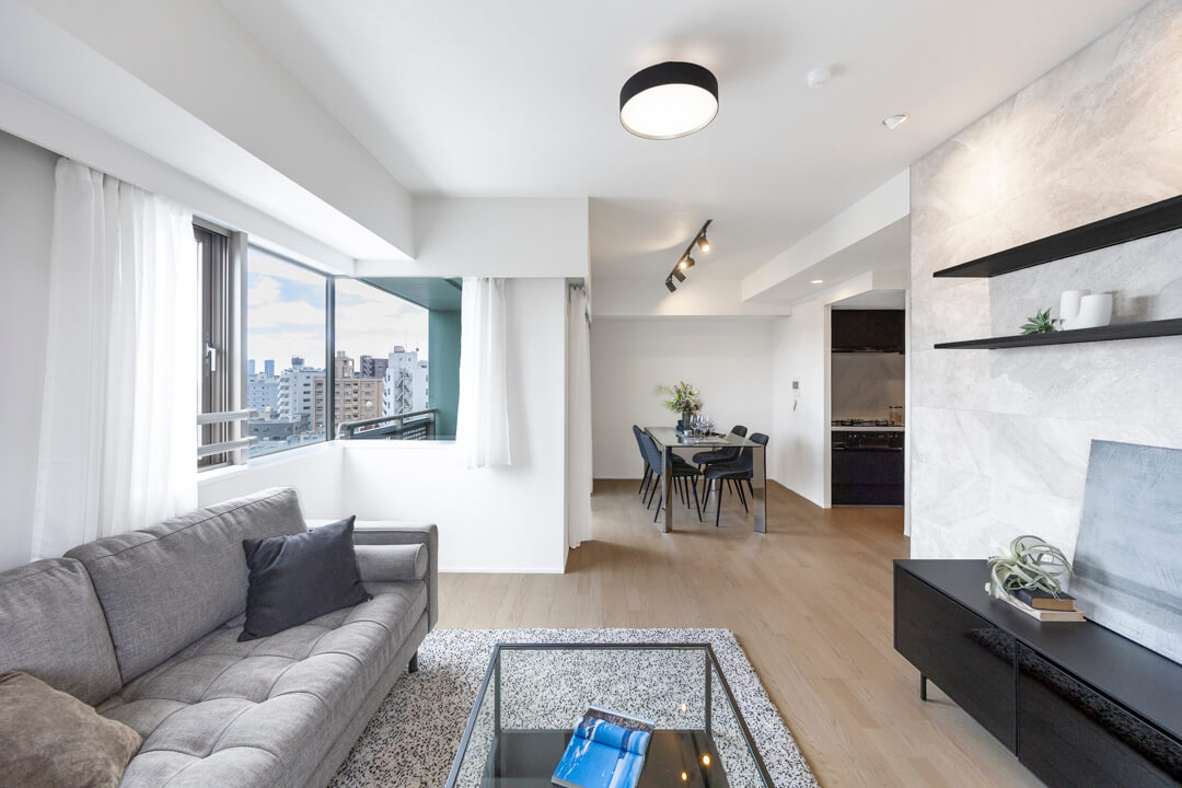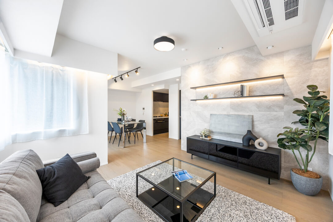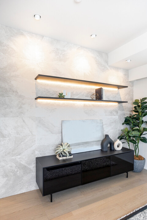 キッチンスペース含め、約18.0帖のLDK。リビングとダイニングスペースがさりげなくゾーニングされた間取りが特徴的です。角部屋につき窓が多く自然光が入る明るい空間。室内からの見晴らしも良好です。リビングスペースの壁は石目調のアクセントウォールが施されており、ホテルライクな品のある空気感。ウォールシェルフは間接照明付きで空間の演出性を高めてくれます。