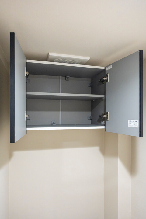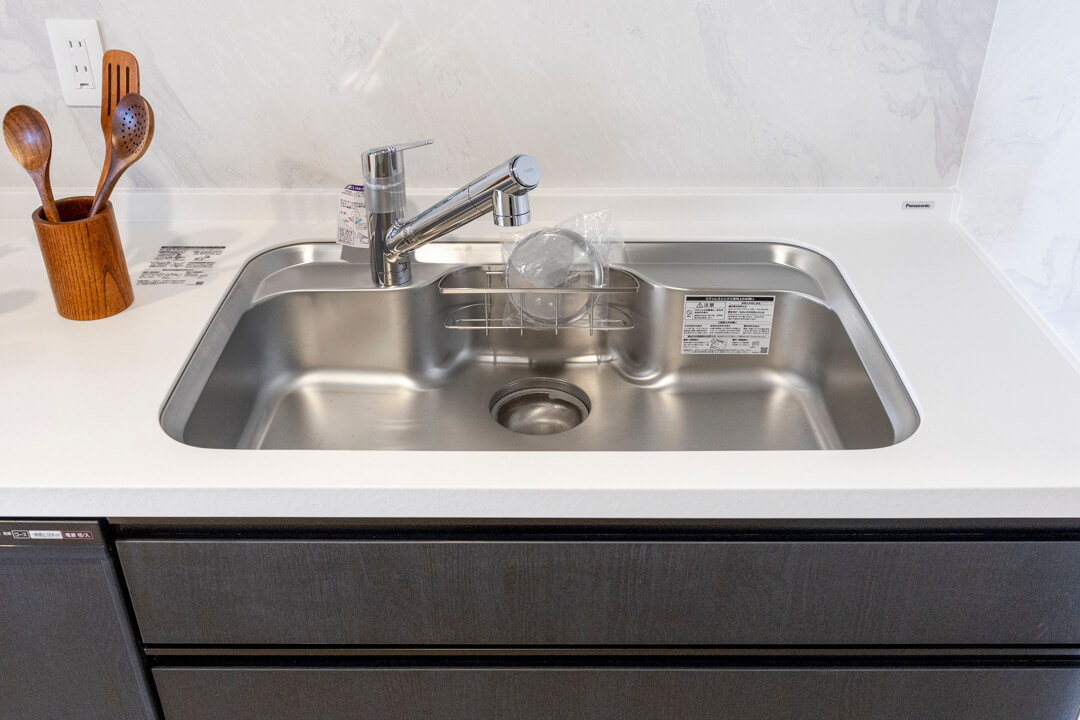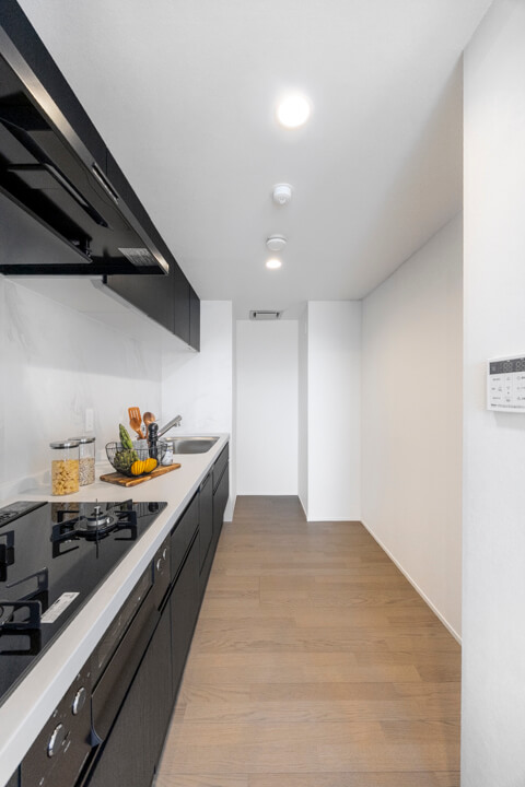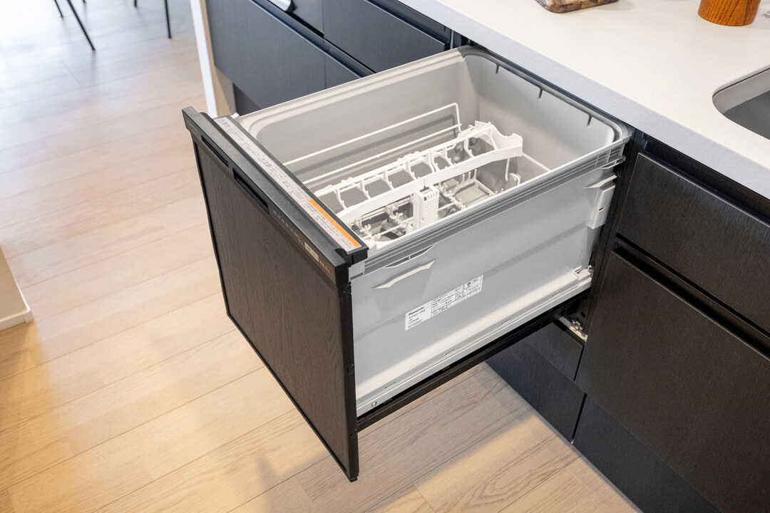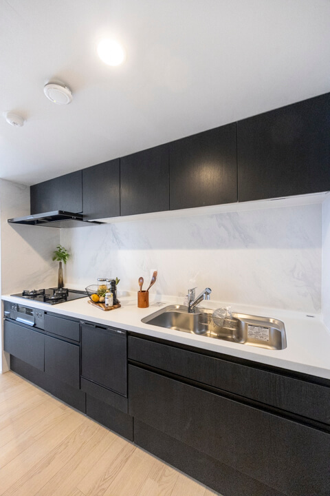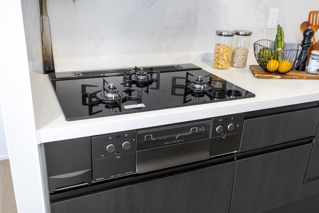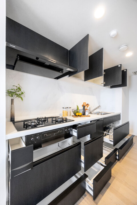 キッチンスペースはリビングダイニングと空間分けされており、キッチンまわりの生活感をさりげなく目隠しできます。料理が捗る3口ガスコンロ、家事の時短に心強い食洗機付きで設備も充実。モノの出し入れがしやすい引き出し式のキャビネットで使い勝手の良さもポイントです。