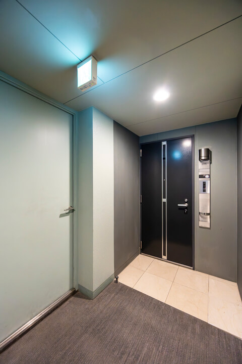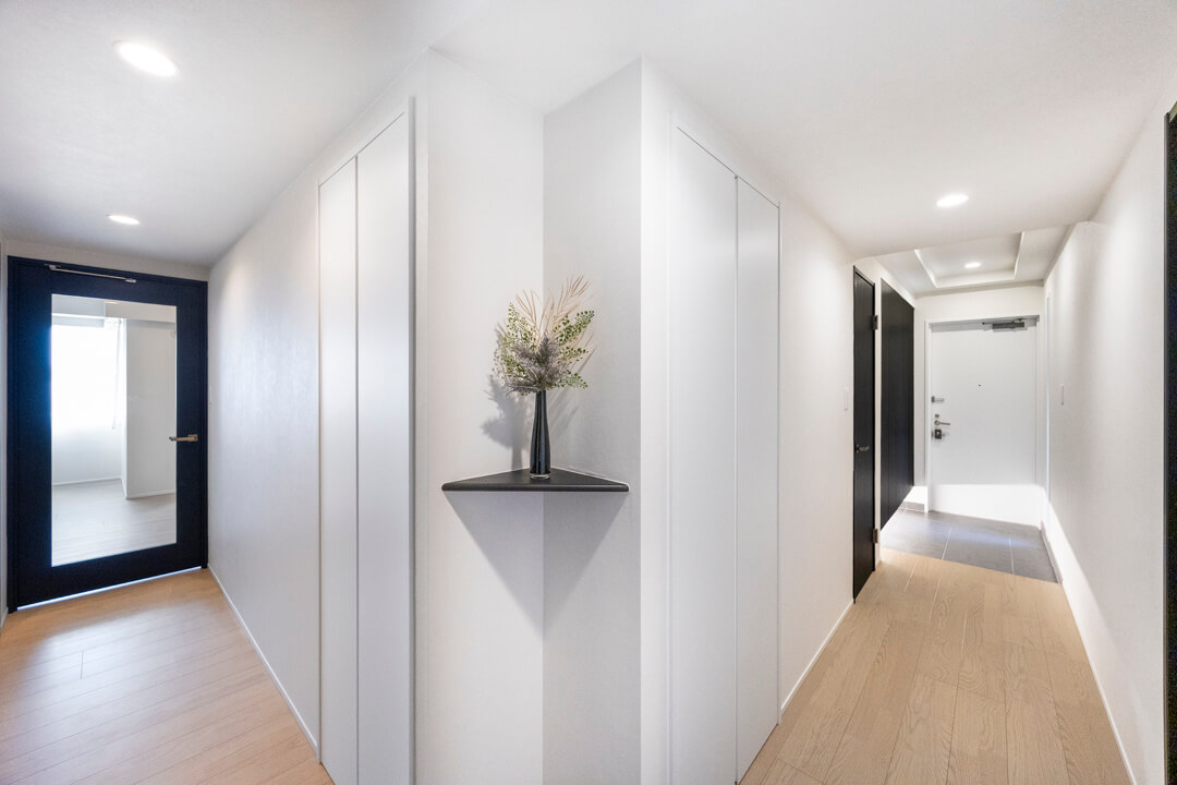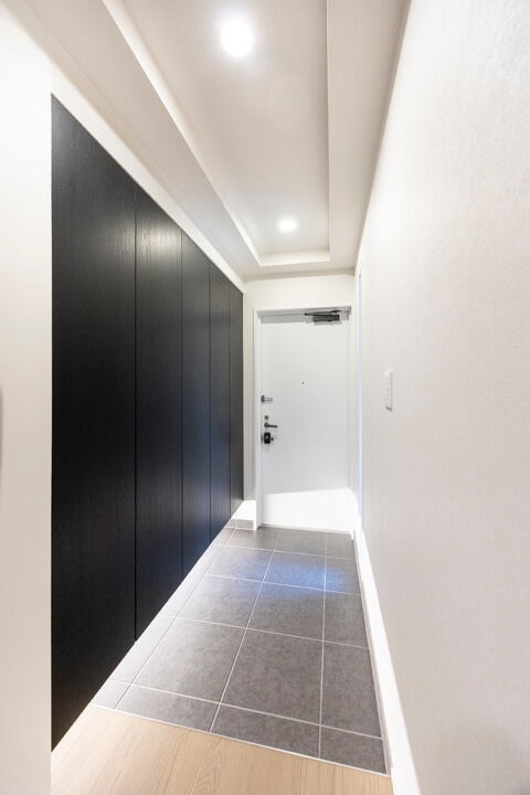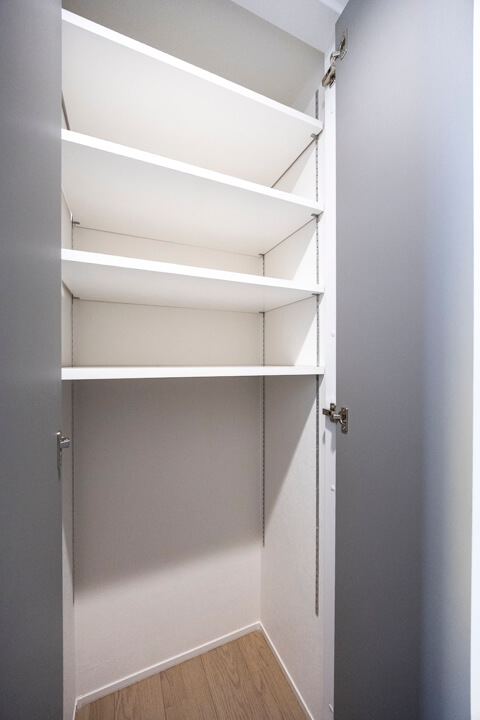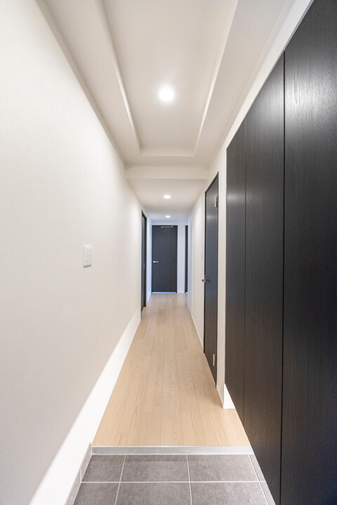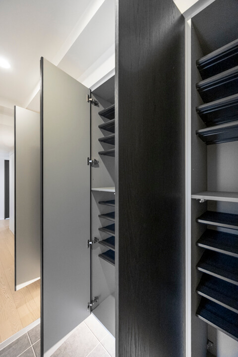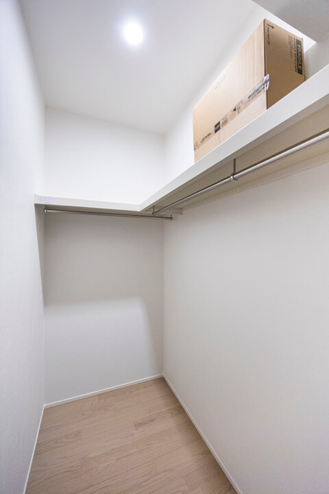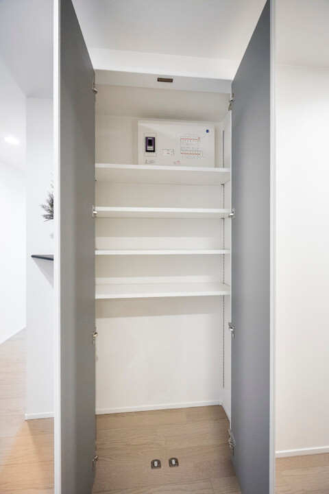 玄関には大容量のシューズボックスを完備。靴がたっぷり収納可能、足元をやさしい光で照らしてくれるフットライト付きです。また、廊下にも物入が2ヵ所備わっており、収納スペースが充実しています。