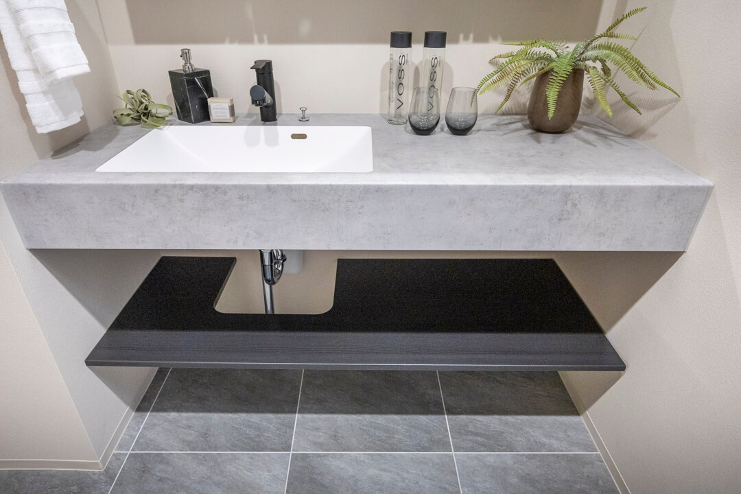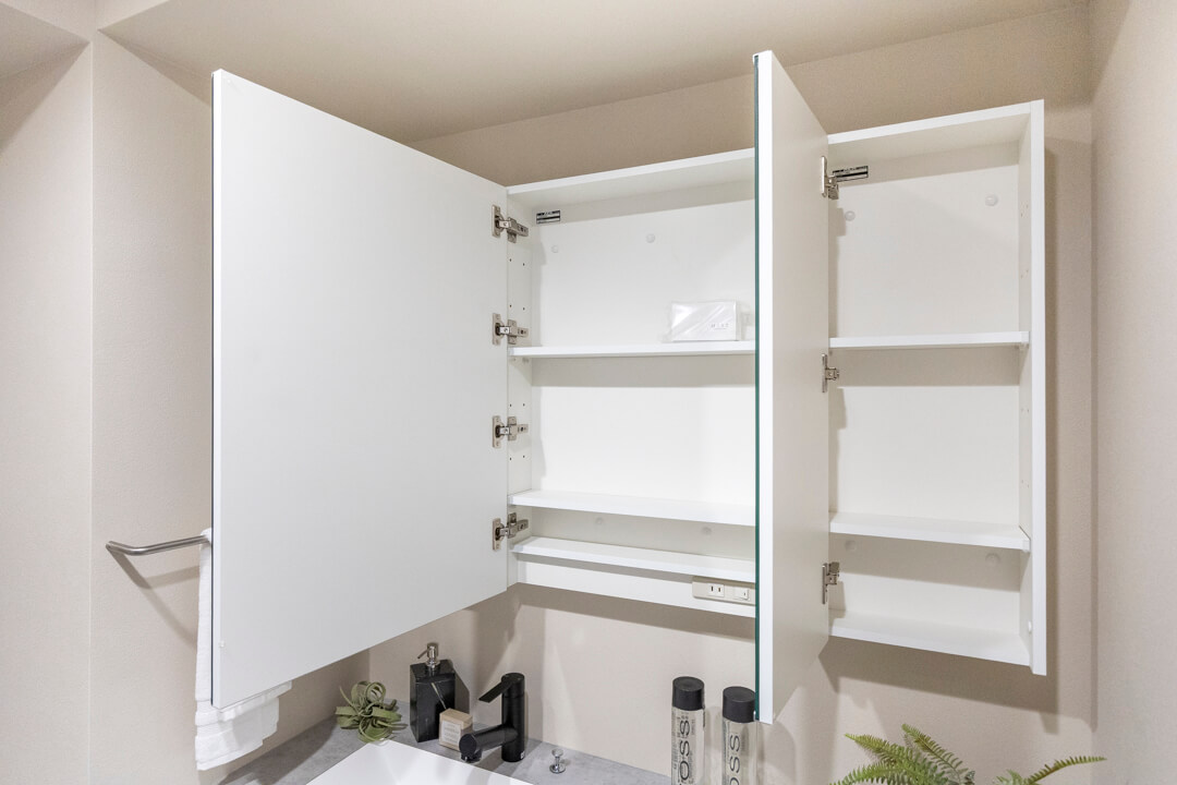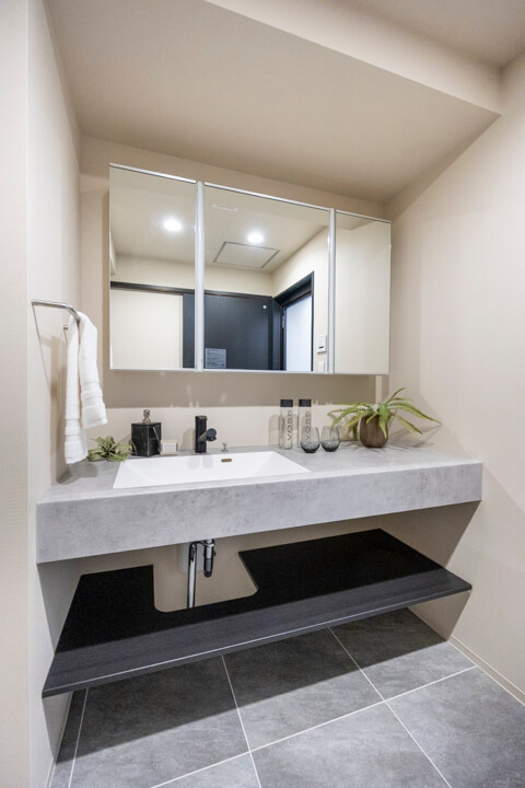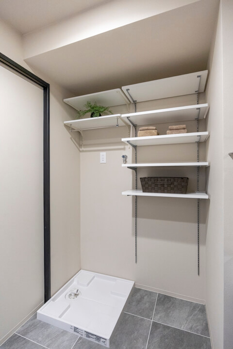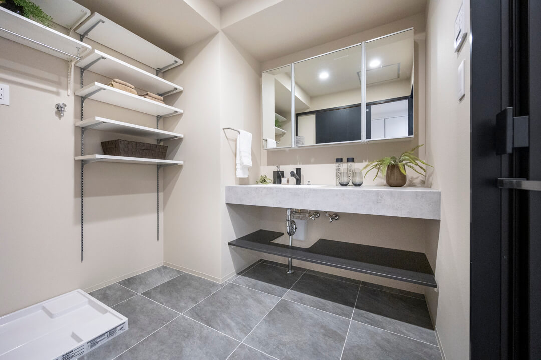 ホテルライクなお洒落な雰囲気の洗面室。洗面まわりの小物がすっきり整頓できるミラーボックス付きでいつでも整った状態をキープできそうです。手洗い器が左寄せに設置されており、その分カウンタースペースが広々使えます。洗濯機置き場の横には可動棚も設置されており、収納スペースもしっかりと確保されています。