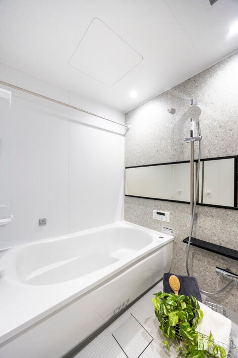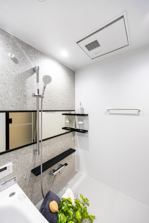 バスルームは追い炊き機能の他、衣類乾燥・換気・暖房・涼風の4つの機能が備わっており、一年中快適にバスタイムが楽しめます。ランドリーパイプも付いていて雨の日や冬場の洗濯にも困りません。浴槽はステップ付きで、全身浴と半身浴、どちらもしやすくなっています。