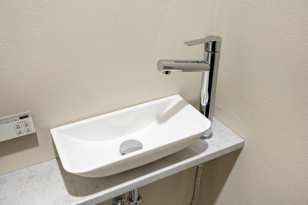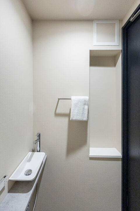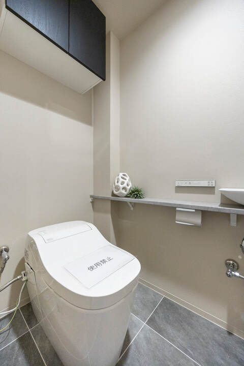 廊下に面したレストルーム。空間がすっきり見えるタンクレストイレです。独立型の手洗い器、収納スペース付き。ウォシュレットリモコンはスティック型でスタイリッシュな雰囲気。
