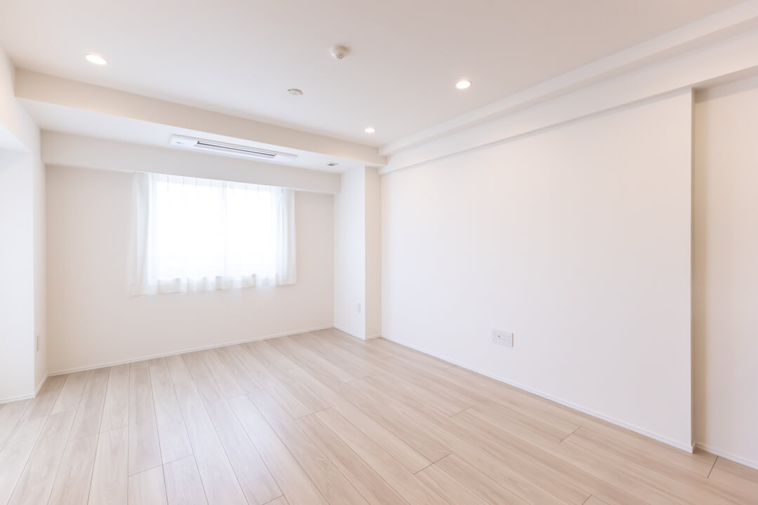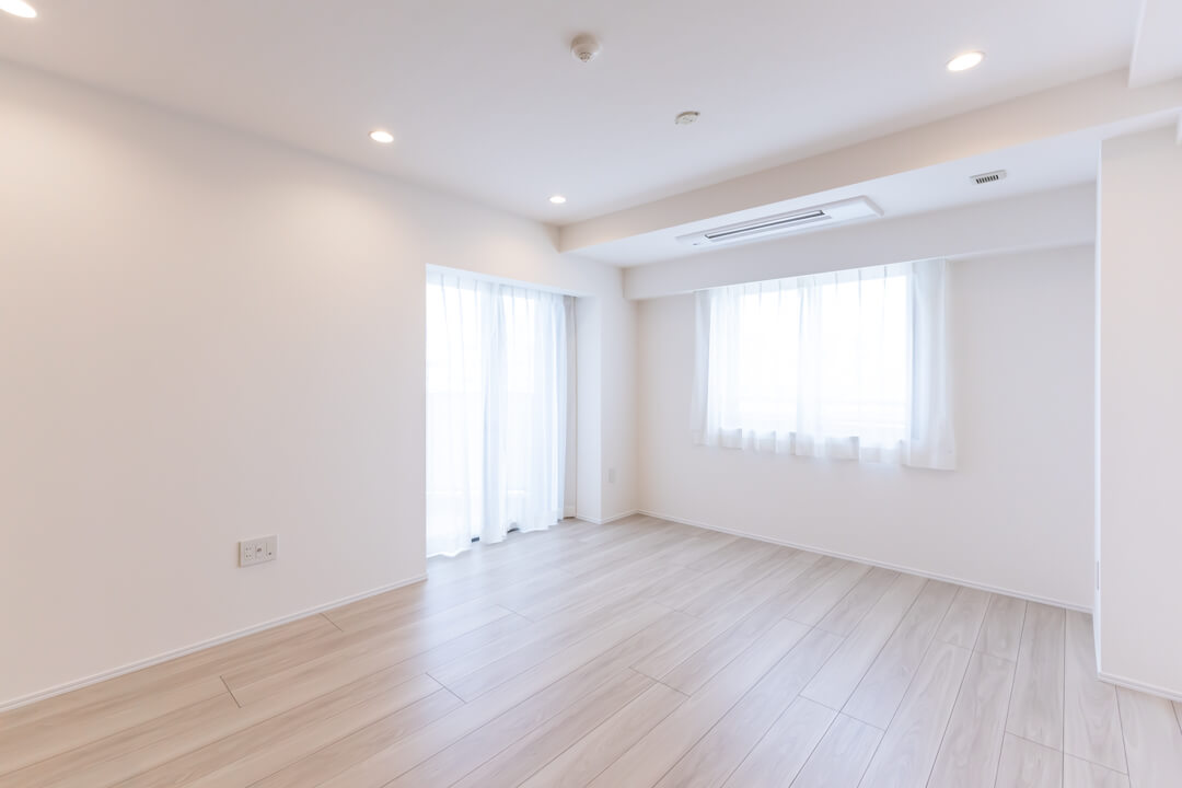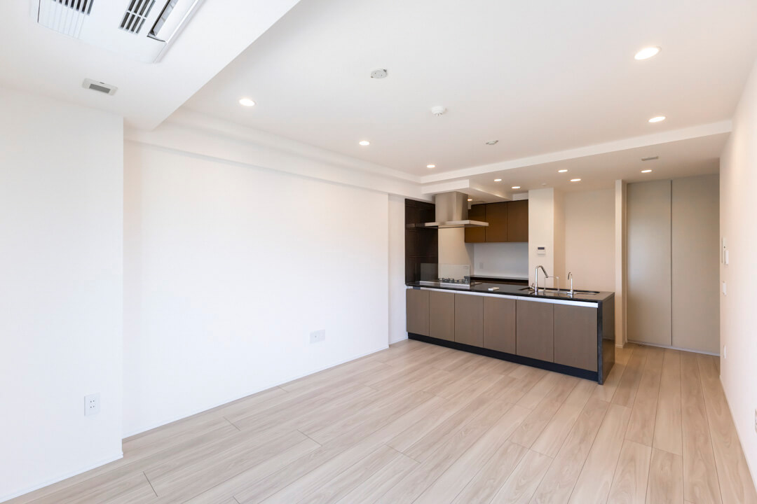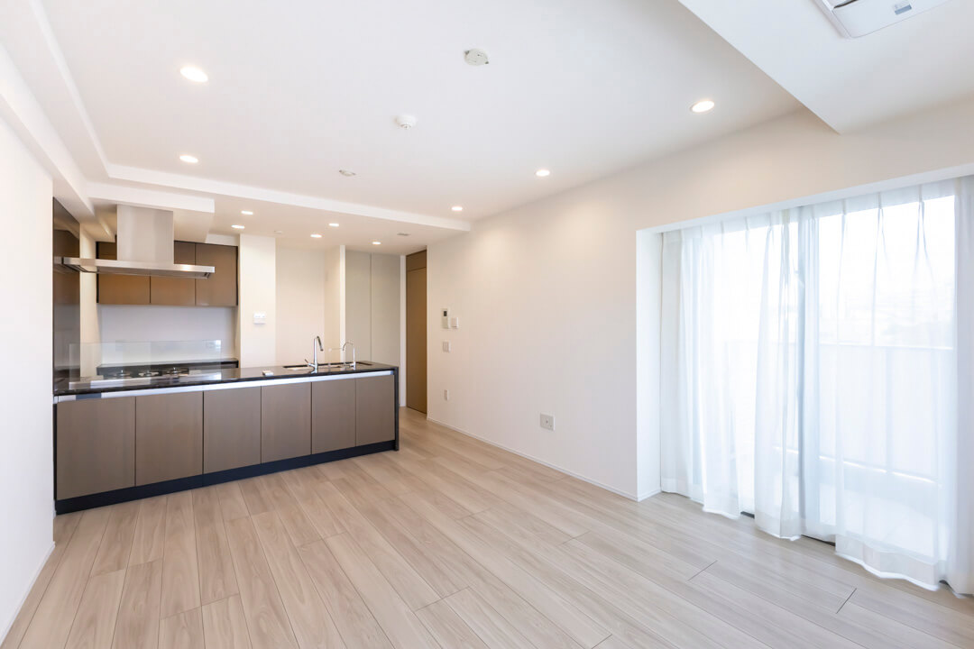 約15.5帖のLDK。北西2面採光で明るい光が届きます。白い壁紙に木目フローリングを採用した内装はインテリアを選ばず、家具選びの楽しみが広がりそうです。エアコンはスタイリッシュなビルトインタイプで、空間に奥行きをもたらします。