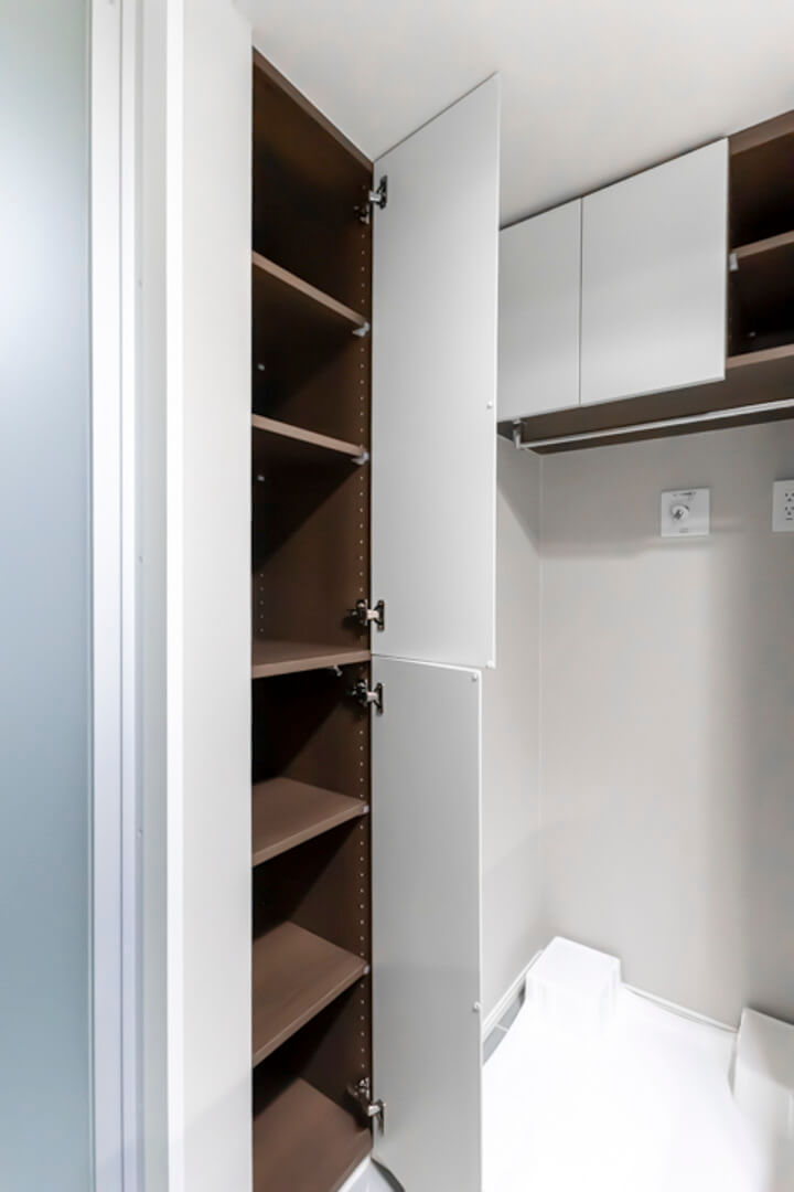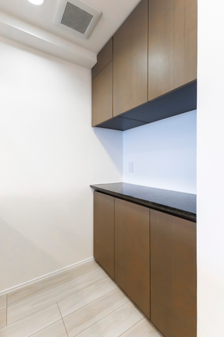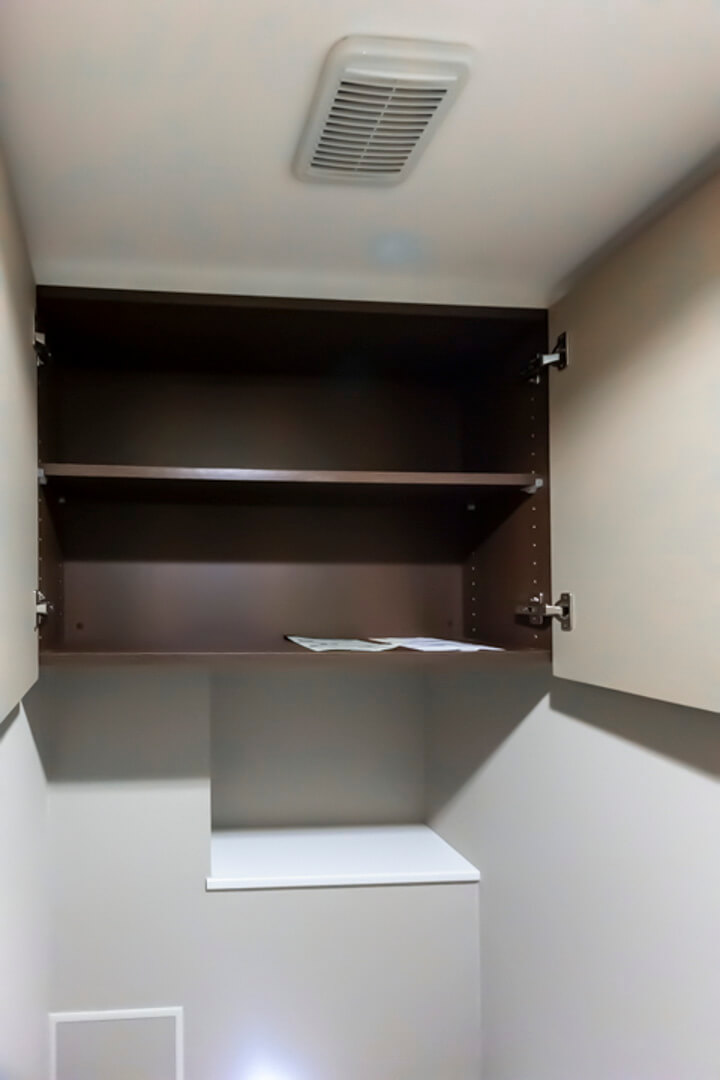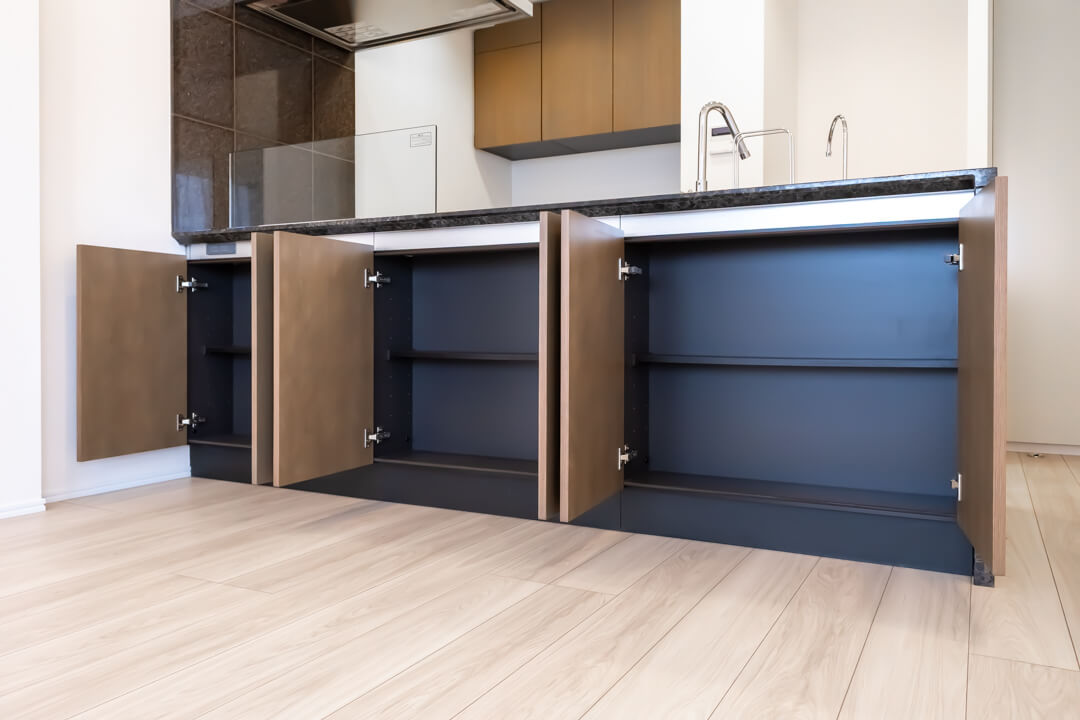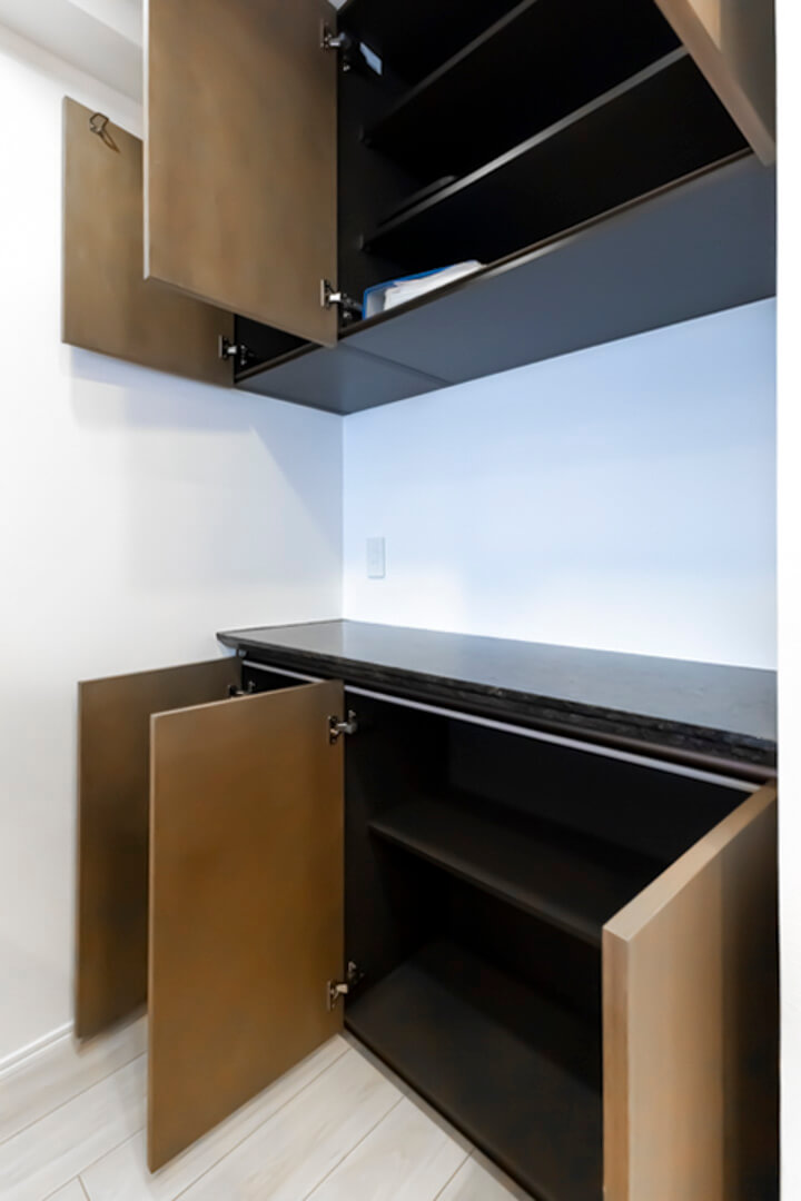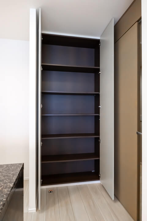 背面には収納力のあるカップボードを完備。キッチンと同じデザインで統一感があります。右側には可動棚もあり、収納豊富◎。食料品のストックや食器類を整理整頓でき、ごちゃごちゃしがちなキッチンまわりがすっきり片付きそうです。