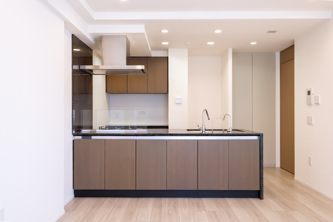石目カウンター&木目デザインで高級感の漂うキッチン。人気の対面タイプです。開放的な気分で調理ができ、家族やゲストとの会話を楽しむことができます。コンロ前には油跳ねガードが設置されていて安心ですね。