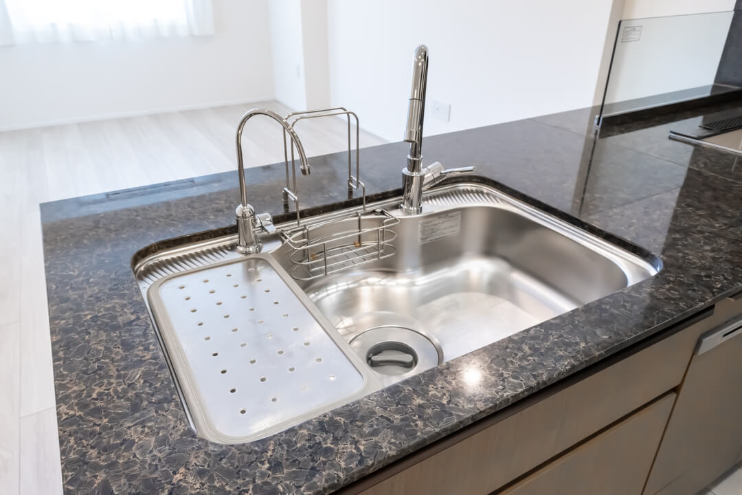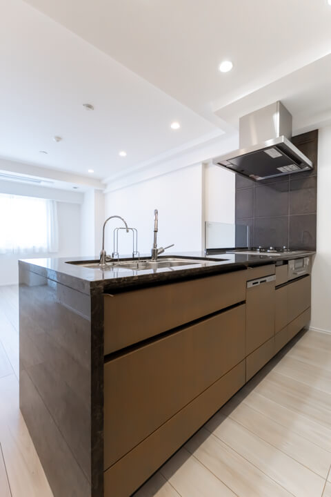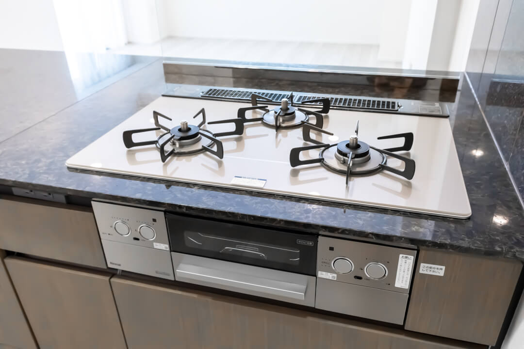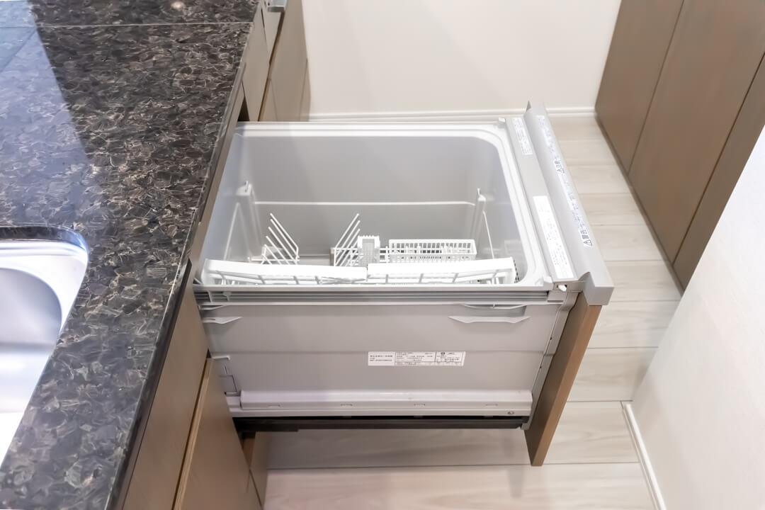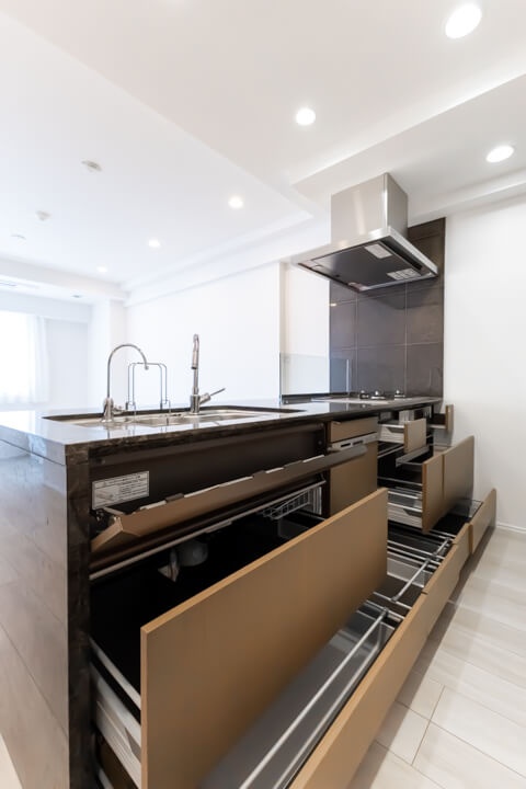 効率良く調理ができるグリル付3口ガスコンロや、後片付けの捗る食洗機を内蔵。さらに、シンクにはディスポーザーが付いています。料理後すぐに生ゴミを処理できるので、掃除の手間が軽減され、悪臭の原因を防いでくれます。