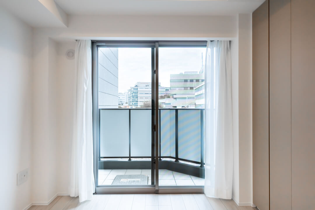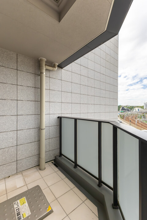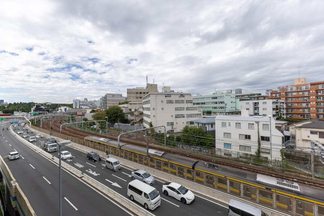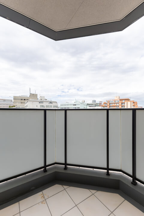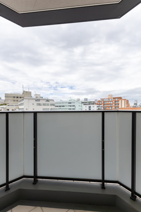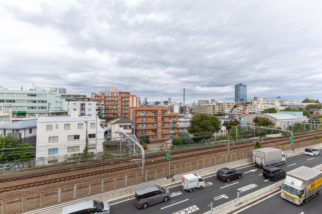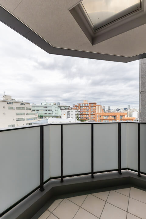 バルコニーは3ヶ所にあり、各居室に面しています。6階部分で抜けのある眺め。南側には赤坂御用地の緑を望むことができますよ。眼下に線路、高速道路が見えますが、2重サッシで騒音対策がされています。