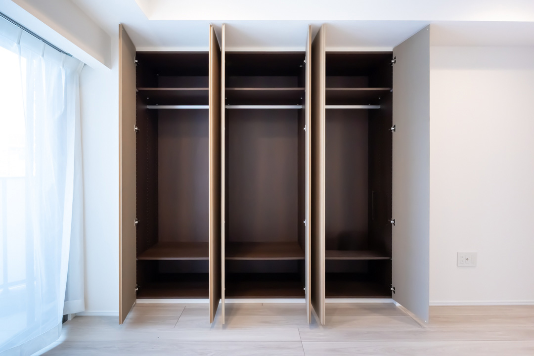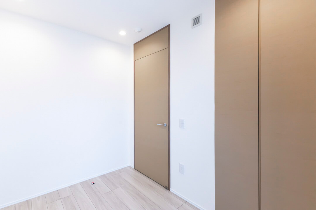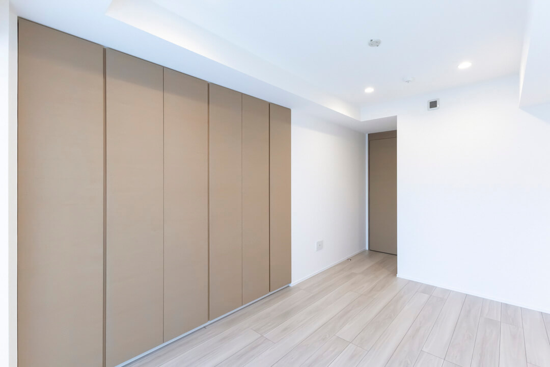 約7.5帖の寝室1。バルコニー付きで開放感があり、主寝室にぴったりです。大容量のクローゼットが並び、収納豊富◎。散らかりがちな荷物をすっきり収納し、居室空間を有効活用できそうですね。