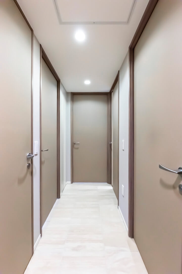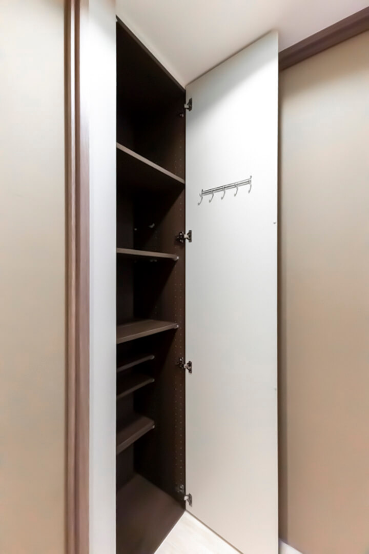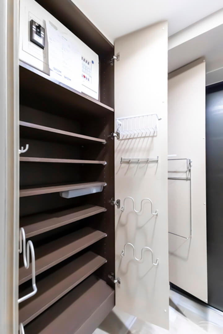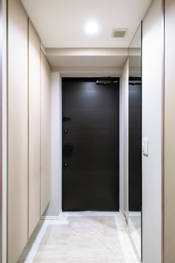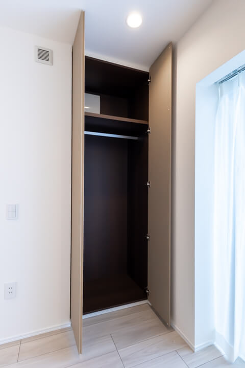 自動点灯式の照明が付いていて、いつも明るく出迎えてくれる玄関。荷物で両手が塞がっている時や夜遅く帰宅した時に、スイッチを探す手間がかからず助かります。全身鏡付きで奥行きUP。靴を履いた状態でコーディネートチェックができるのも嬉しいポイントです。大容量のシューズボックス、廊下収納完備で収納スペースも充実しています。