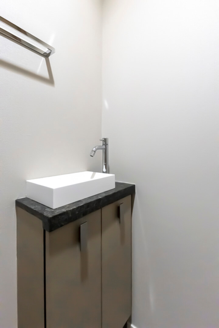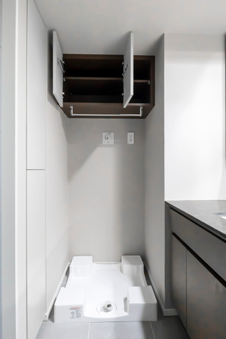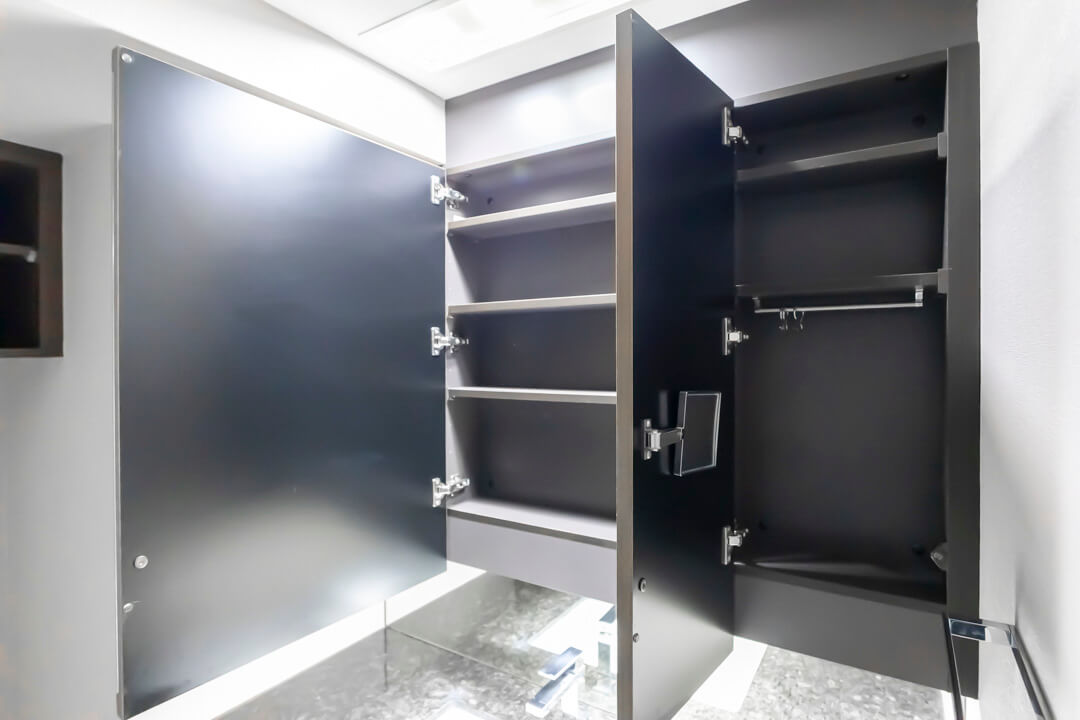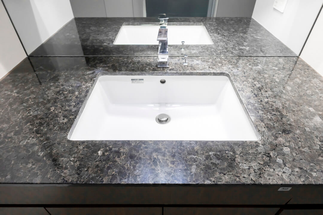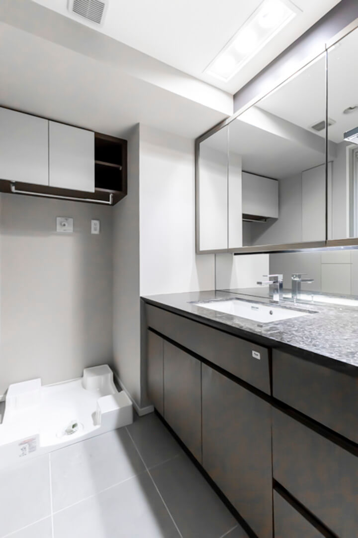 石調カウンターで高級感の漂う洗面化粧台。大きな三面鏡とミドルミラー付きで身だしなみを整えるのに便利です。カウンタースペースにはゆとりがあり、忙しい朝の身支度もスムーズに行えそうですね。洗面まわりの小物はミラーボックスにすっきり収納可能。背面にはリネン庫もあり、いつも清潔な洗面室をキープできそうです。