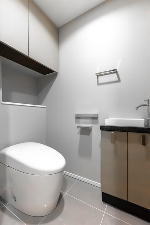 スタイリッシュなタンクレストイレ。TOTO製の洗浄便座付きです。便フタは自動開閉式なので、直接触れることなく使用できて衛生的。かがまなくて良いので腰への負担が減るのも嬉しいポイントです。手洗いカウンター&吊戸棚付きで使い勝手の良い空間です。