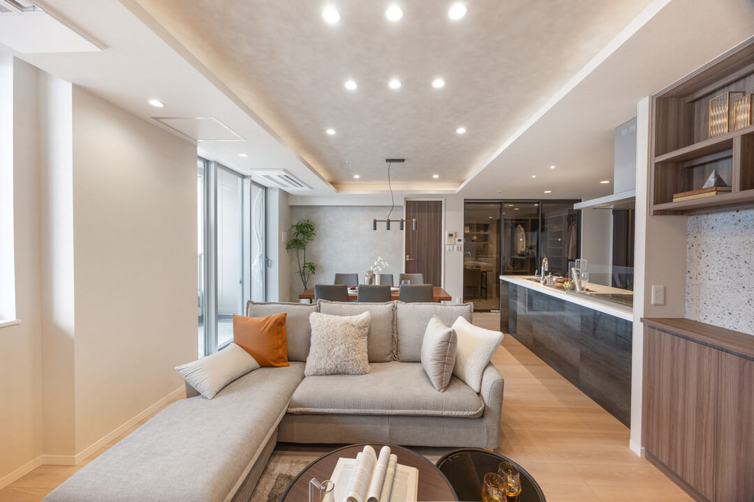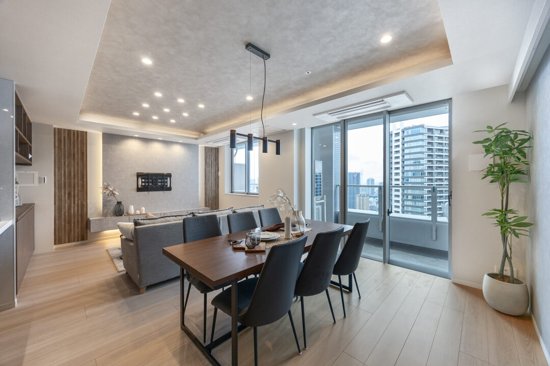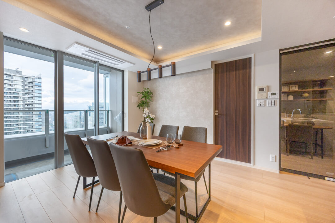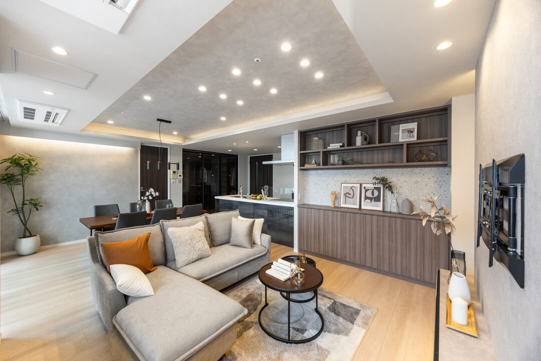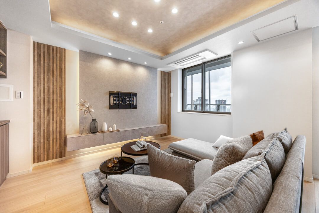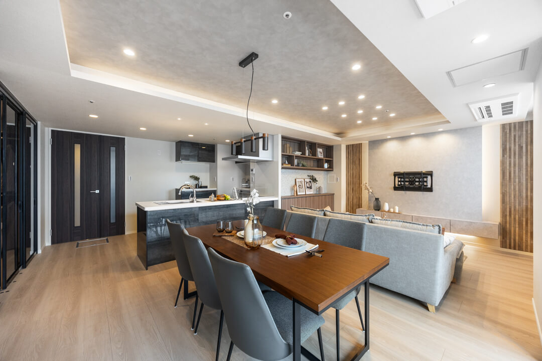 約20.6帖の広々としたLDK。バルコニーに面していて、開放感たっぷりです。ホワイト&木目を基調とした内装にアクセントウォールが映え、ナチュラルモダンな空間を演出。やわらかな間接照明の明かりは癒しをもたらし、暮らしの中に新しい表情をつくりだします。スタイリッシュなビルトインエアコン完備&テレビを壁掛け設置できるのも嬉しいポイントです。