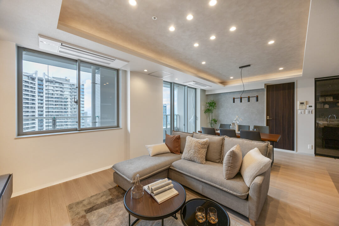 2008年1月竣工、地下2階付地上58階建・総戸数2797戸のツインタワーレジデンス。都営大江戸線「勝どき」駅より徒歩7分ほどの立地です。高いセキュリティ性と充実の共用施設を兼ね備え、安心・快適な暮らしが叶います。今回のお部屋は50階部分、専有面積89㎡の2SLDK。バルコニーに面したLDKは開放感があり、家族でゆったり過ごせます。アクセントウォールや間接照明を採用したナチュラルモダンな内装が魅力的ですよ。1620サイズのビューバスでは、癒しのバスタイムを。申請は必要ですが、ペットは2匹まで飼育可能です。