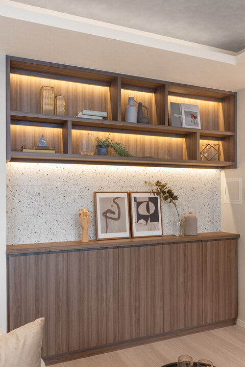 間接照明付きのキャビネットを設置。小物や植物をお洒落にレイアウトできます。季節に合わせて飾るものを変えたり、お気に入りのコレクション品を並べたり、、インテリアの楽しみが広がりそうですね。